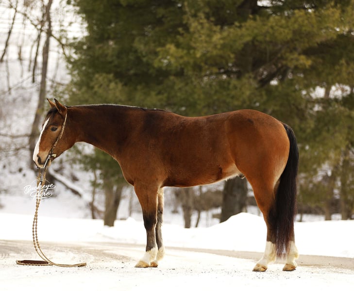 If you are looking for the total package wrapped in chrome, class, and character, Atticus could be your guy. Standing a strong and sturdy 14.2 hands, this 2021 Quarter Horse Cross Bay gelding is as eye-catching as they come, marked with four crisp white socks, a bold white blaze, and a rich black mane and tail that demand attention wherever he goes. He has that balanced, athletic build everyone loves, and he carries himself with confidence and presence whether he is in the arena or out on the trail. But his good looks are only the beginning. Atticus is a true gentleman inside and out — the first to meet you at the gate and happiest when he is by your side. He genuinely enjoys people and aims to please in everything he does. He is the kind that builds a connection quickly and wants to be your partner. In the barn he is quiet, respectful, and well-mannered. He stands tied, behaves in his stall, and is easy with other horses or perfectly content on his own. He hauls well, handles new places with confidence, and settles in without stress. Atticus has truly been there and done that. He has logged miles and miles on the trails, confidently crossing creeks, climbing hills, easing down steep slopes, and stepping over logs without hesitation. He has been ridden on state roads in traffic and remains steady and level-headed. Traps, whips, jugs, commotion — none of it phases him. He keeps a calm mind and is the same dependable horse every time you swing a leg over. If you are looking for something extra special, Atticus brings the wow factor. He will sit down on cue, step up onto a pedestal, and you can even stand on top of him. He enjoys having a job and showing off what he knows, always willing and always trying his best for his rider. Under saddle he is smooth, balanced, and correct in all his gaits with a comfortable stride you can ride all day. He side passes, picks up both leads with ease, neck reins confidently, and rides soft in the bridle. He is responsive without being overly sensitive — forgiving and safe for a beginner, yet broke and refined enough for an advanced rider to truly appreciate. He can even ride bridle less, which speaks volumes about his training and willingness. With his standout color, solid training, kind heart, and steady mind, Atticus is the kind that does not come along every day. From the arena lights to long trail rides, he is ready to be someone’s trusted partner and turn heads while doing it. If this sounds like the horse that you have been looking for, please feel free to reach out to Duane @ 330-231-2324