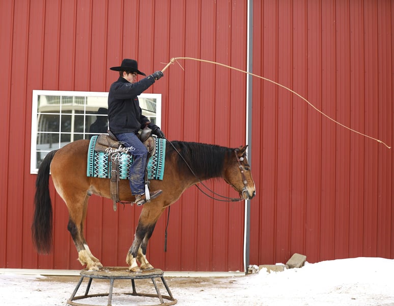 Wenn Sie nach dem Gesamtpaket aus Charme, Klasse und Charakter suchen, könnte Atticus genau der Richtige für Sie sein. Mit einer Stockmaß von 14,2 Händen ist dieser 2021 geborene Quarter Horse Cross Bay Wallach so auffällig wie kaum ein anderer, geprägt von vier klaren weißen Socken, einer markanten weißen Blesse sowie einer reichen schwarzen Mähne und Schweif, die überall, wo er ist, alle Blicke auf sich ziehen. Er besitzt die ausgewogene, athletische Statur, die jeder liebt, und trägt sich mit Selbstvertrauen und Präsenz – egal ob in der Arena oder auf dem Trail. Doch sein gutes Aussehen ist nur der Anfang. Atticus ist ein wahrer Gentleman – innen wie außen. Er ist der erste, der am Tor auf dich wartet, und am liebsten ist er an deiner Seite. Er schätzt den Kontakt zu Menschen sehr und möchte in allem, was er tut, gefallen. Er baut schnell eine Verbindung auf und möchte dein Partner sein. Im Stall ist er ruhig, respektvoll und gut erzogen. Er steht ruhig angebunden, verhält sich in seiner Box und ist im Umgang mit anderen Pferden ebenso gelassen wie auf eigenem Terrain. Er transportiert sich problemlos, meistert neue Orte mit Selbstvertrauen und kommt stressfrei an. Atticus hat schon viel erlebt: Er ist auf Trails unterwegs gewesen, hat confidently Flüsse überquert, Hügel erklommen, steile Abhänge gemeistert und über Baumstämme getreten – ohne Zögern. Er wurde auf Staatsstraßen im Verkehr geritten und bleibt ruhig und ausgeglichen. Zäune, Peitschen, Kanister, Aufregung – nichts bringt ihn aus der Ruhe. Er bewahrt stets einen klaren Kopf und ist jedes Mal zuverlässig, wenn man den Fuß in den Steigbügel setzt. Wenn Sie nach etwas Besonderem suchen, bringt Atticus den Wow-Faktor mit. Er kann auf Kommando sitzen, auf eine Plattform steigen und sogar darauf stehen. Er liebt es, eine Aufgabe zu haben und sein Können zu zeigen, ist immer bereit und gibt sein Bestes für seinen Reiter. Unter dem Sattel ist er geschmeidig, ausgeglichen und in allen Gangarten korrekt mit einem angenehmen Schritt, den man den ganzen Tag reiten kann. Er seitwärts, nimmt beide Führungen mühelos auf, lenkt selbstsicher mit der Halsreining und reitet weich im Gebiss. Er ist sensibel, aber nicht überempfindlich – verzeihend und sicher für Anfänger, aber auch feinfühlig und ausgefeilt genug für einen fortgeschrittenen Reiter. Er kann sogar gebisslos geritten werden, was viel über seine Ausbildung und seine Bereitschaft aussagt. Mit seiner auffälligen Farbe, solider Ausbildung, seinem freundlichen Wesen und seinem ausgeglichenen Geist ist Atticus ein Pferd, das nicht alle Tage kommt. Vom Turnierplatz bis zu langen Trailritten – er ist bereit, jemandem ein vertrauenswürdiger Partner zu sein und dabei alle Blicke auf sich zu ziehen. Wenn Sie glauben, dass dies das Pferd ist, nach dem Sie gesucht haben, zögern Sie nicht, sich bei Duane unter 330-231-2324 zu melden.