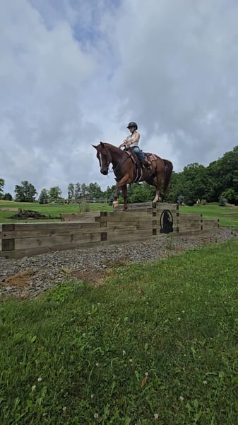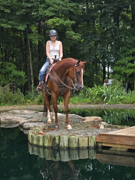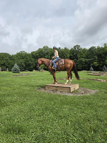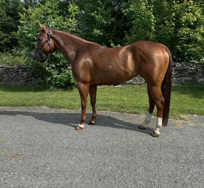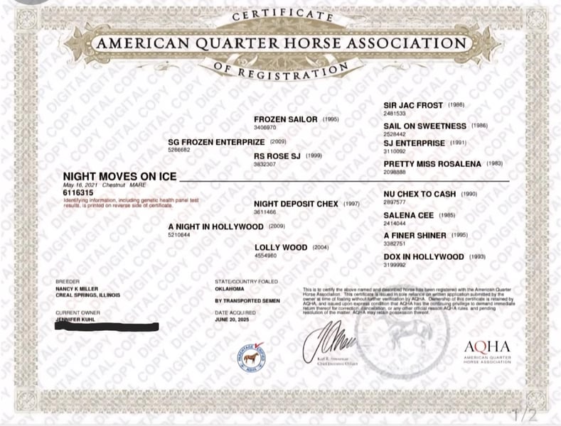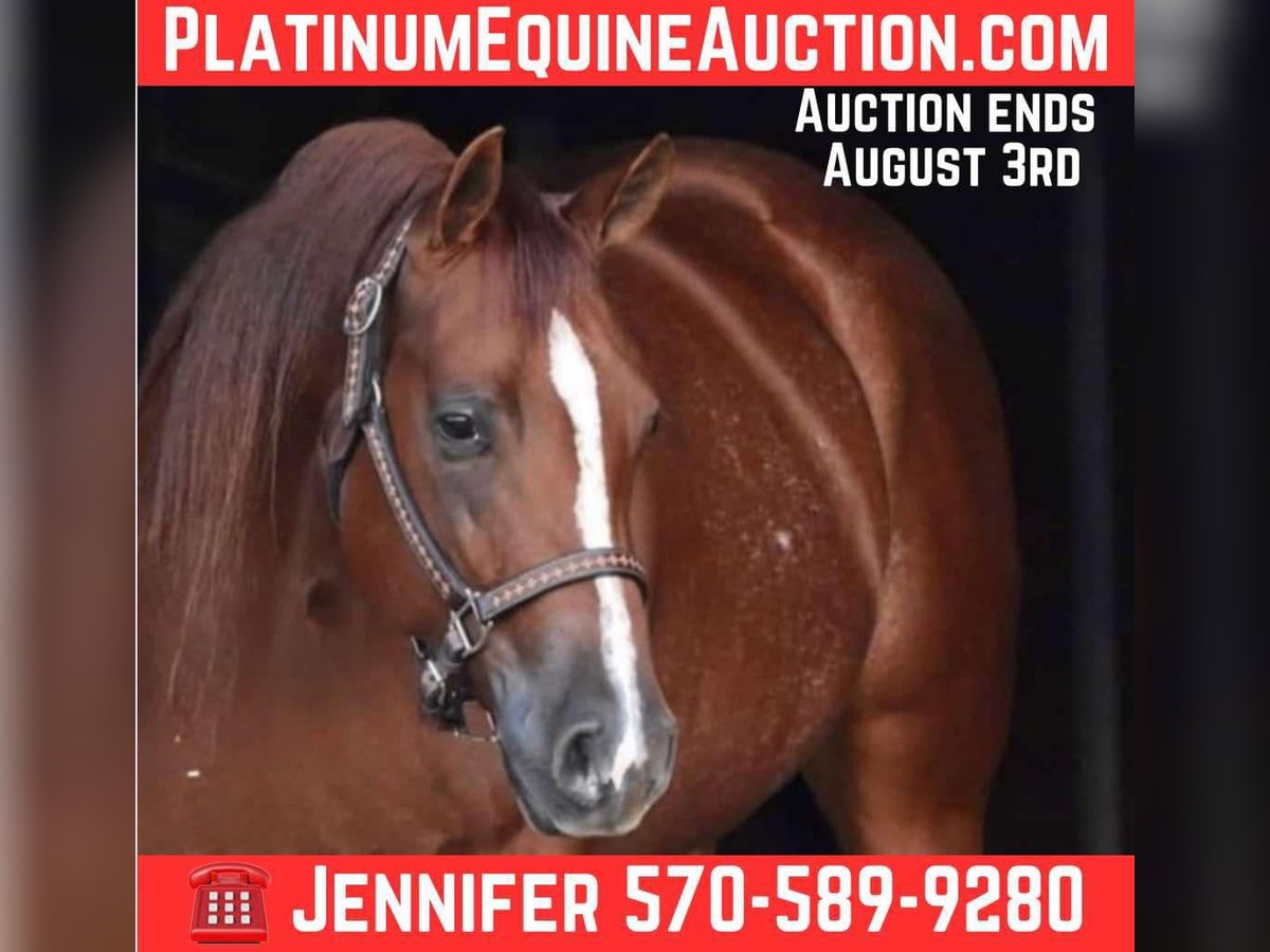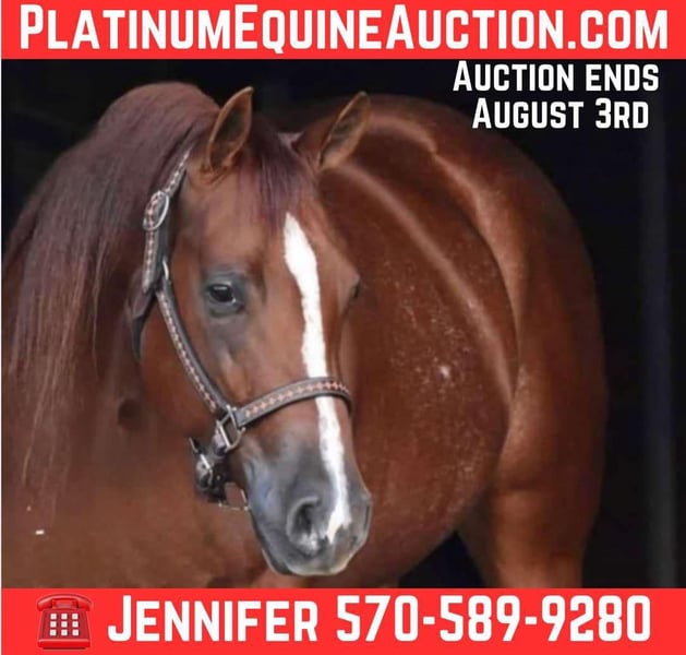 ONLINE AUCTION Place your bids at www.PlatinumEquineAuction.com Starting Bid $3500 Auction ends August 3rd, 2025 Need a new saddle? Check out White Rock Saddles on our website or Facebook Night Moves On Ice aka Margarita is a 2021 model registered AQHA Mare by SG Frozen Enterprize out of a Night Deposit Chex mare standing at 14.3. If you are looking for safe, quiet, and as honest as they come, look NO further. Margarita is the horse everyone wishes they had and what 99% of people NEED. Honest, safe, sweet and steady are just a few words to describe this beauty. This 4 year old AQHA chestnut mare stands 14.3hh and comes loaded with a rock solid temperment, plenty of training, killer good looks and that kind eye we all look for. Whether you are a beginner needing something trustworthy or an experienced rider who just wants to enjoy a relaxing worry-free ride, Margarita has your back. Margarita’s favorite speed? Slow and quiet. She’s happy to go for a trail ride, explore the obstacle park, or ride around in the arena. She has been hauled to new environments and always acts like she’s been there a hundred times before. Versatile is a great word to describe Margarita. She’s been ridden western, English, goes quietly in the arena, and will jump something small just for fun. This gal will never ask for more than you are ready to give. She is more whoa than go all day long. Margarita is a great confidence booster, and can take a joke. Her calm energy and no nonsense attitude can allow you to feel safe and enjoy the ride. Margarita will ride alone or in a group, willing to try anything you ask of her. She stands quiet to be mounted, rides off leg pressure, will side pass, stop, back, and has a great spin. If you are looking for a smooth ride, this mare is light and airy on her feet. She will meet you at the gate, and follows you around like a puppy. Margarita stands to be tied , groomed, clipped and bathed. Not a problem to load and be hauled. The mare is gentle around children and very kid safe. This is a horse that will be an angel for the vet and farrier, absolutely does not have a mean bone in her body. She requires no special maintenance. For further questions please contact Jennifer Kuhl 570-589-9280. ONLINE AUCTION Place your bids at www.PlatinumEquineAuction.com Starting Bid $3500 Auction ends August 3rd, 2025 Need a new saddle? Check out White Rock Saddles on our website or Facebook