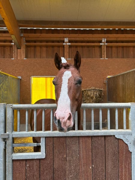 Der hübsche 5.5 Jahre alte Fuchs mit weisser Blesse ist sehr klug, an seiner Umwelt sehr interessiert, hat einen freundlichen Charakter und ist sozial in der Gruppe. Ob in der Halle oder beim Ausreiten, der Quarter-Appaloosa Wallach zeigt sich stets willig und lernfreudig und geht alleine oder in der Gruppe ins Gelände. Aufgewachsen ist er in Freiheit auf einer Alm in Südtirol mit 50 Fohlen und 20 Mutterstuten. Im Alter von 2.5 Jahren kam der Wallach in einen gemischten Offenstall mit 18 Pferden und ist auch heute glücklich, wenn er in einem Offenstall leben kann, eine Ganzjahresweide zur Verfügung hat und Pferdekumpels um sich hat. Aus seiner Fohlenzeit hat der Quarter-Appaloosa Wallach ein Überbein am linken Vorderbein, das ihn keineswegs beeinträchtigt. Er ist ein wunderbares Freizeitpferd, dem jetzt altersentsprechend nur noch der Feinschliff beigebracht werden muss. Der Wallach wurde langsam und feinfühlig eingeritten, hat nie gebockt, ist noch nie gestiegen oder durchgegangen und hat auch ansonsten keine Macken, aber eine klar definierte Persönlichkeit. Aktuell ist er 1.50 m gross, läuft barhuf mit Hufschuhen und ist kerngesund. Sein Equipment wird für CHF 800 dazu verkauft (Wildledersattel, Trense, Kappzaum, Sidepull, Hufschuhe, Lammfellpad, Winterdecke (300g).