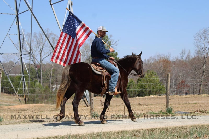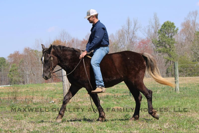 ONLINE AUCTION Place your bids at www.PlatinumEquineAuction.com Starting Bid $3500 Auction ends April 13th, 2025 Need a new saddle? Check out White Rock Saddles on our website or Facebook! Sammy is a 4yr old 14.3h Friesian/Quarter horse cross gelding! Sammy is a very unique Chocolate color with a flaxen mane and tail. He is stocky and built to last. Sammy has a great personality that anyone would love and he is always the first one to greet you in the pasture! He has a very solid wtc that anyone could sit. He takes his leads and lopes nice cirlces. We have taken him on trail rides in the mountains where he will cross anything that you ask from deadfall to creeks to ditches, steep slopes don’t bother him either and also done tons of riding along the side the highway. He will ride Western or English and would be a great horse to go over the rails! Here is a super safe and calm minded gelding!! He is 100% Safe and Sound! We are located in Cherryville, NC if you would like to schedule an appointment to come see him and we can set up delivery anywhere in the US! If you have any questions, would like to facetime call or come see Sammy in person Call or Text Landon with Maxwell Family Trail Horses 704-689-9035. ONLINE AUCTION Place your bids at www.PlatinumEquineAuction.com Starting Bid $3500 Auction ends April 13th, 2025 Need a new saddle? Check out White Rock Saddles on our website or Facebook!