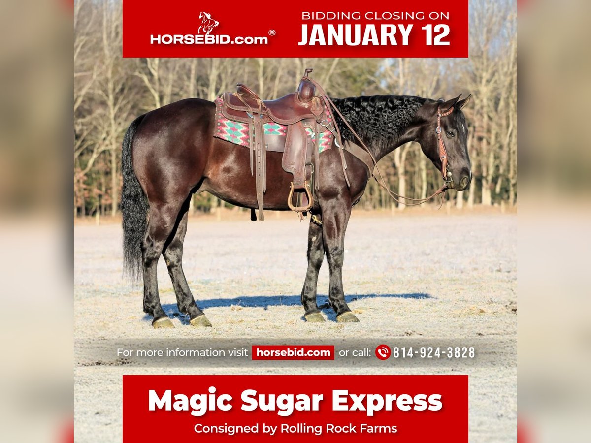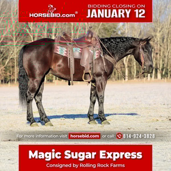 ♦️𝐍𝐄𝐖 𝐘𝐄𝐀𝐑'𝐒 𝑬𝒙𝒕𝒓𝒂𝒗𝒂𝒈𝒂𝒏𝒛𝒂♦️ Happening now thru MONDAY | JANUARY 12th - Available EXCLUSIVELY on HorseBid's website! For more details and to register visit: www.Horsebid.com CONSIGNOR CONTACT: Rolling Rock Farms 814-924-3828 LOCATION: Miola, PA BREED: Quarter horse REGISTERED: Yes REGISTERED NAME: MAGIC SUGAR EXPRESS COLOR: Black HEIGHT: 14.3 AGE: 5 GENDER: Gelding Magic Sugar Express, known as Magic, is a 5 year old black AQHA gelding standing 14.3 hands tall. While he is young in age, Magic rides with the feel, confidence, and reliability of a much older, well seasoned horse. He is exceptionally broke, honest, and uncomplicated, making him a standout for anyone looking for a quiet, well trained gelding with a great mind. In the arena, Magic is a pleasure to ride. He will one hand ride comfortably, neck rein correctly, and responds smoothly off your leg. He carries himself naturally with a soft headset at the trot or will travel quietly on a loose rein without needing to be held together. He has the ideal amount of forward motion, not lazy and not hot, giving the rider a very balanced and enjoyable ride. Magic is confident and dependable with obstacles and new experiences. He will carry flags, work over tarps, and pull a sled calmly and willingly. He is easy and respectful to handle on the ground, standing quietly for saddling, blanketing, and clipping. He will cross tie, has good ground manners, and is easy to be around. In the pasture, he gets along well with other horses and sits low to middle in the pecking order. Outside of the arena, Magic is just as reliable. He loads easily, hauls well, and trail rides quietly both alone and in a group. He is comfortable around dogs and other farm animals and fits well into a busy barn or ranch environment. He completed a full wellness and health examination on 12/29/25 and is selling with a current negative Coggins, rabies vaccine, and recent deworming. Magic is a versatile, safe minded gelding with a solid foundation and a bright future. Horses with this level of training, consistency, and attitude at his age are hard to find. He is ready to step into a new home and be enjoyed immediately by his next rider.