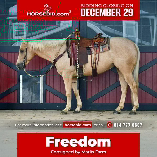 ⚜️ 𝓗𝓮𝓻𝓲𝓽𝓪𝓰𝓮 𝐖𝐢𝐧𝐭𝐞𝐫 𝓒𝓵𝓪𝓼𝓼𝓲𝓬⚜️ Happening now thru MONDAY | DECEMBER 29th - Available EXCLUSIVELY on HorseBid's website! For more details and to register visit: www.Horsebid.com CONSIGNOR CONTACT: Marlis Farm 814 777 0607 LOCATION: Rebersburg, PA BREED: Quarter horse REGISTERED: Yes REGISTERED NAME: MS Freckleface Wimp COLOR: Palomino HEIGHT: 15 AGE: 4 GENDER: Mare MS Freckleface Wimp AKA Freedom is a 4yr old registered AQHA palomino mare that stands the perfect height of 15 hands. She is well bred and is out of an own son of Wimpys Little Step. Freedom has fast become one of the barn favorites and is super fun to ride, she is safe for my boys to ride in the arena and play and have fun with. She is well broke, she neckreins, sidepasses and is gentle and safe. I think she would be a great fit for all level of riders. Freedom rides english and western, she picks up both her leads and takes a small jump. She is soft in the bridle and responsive to leg cues. Freedom is a seasoned trail horse, she goes over logs, through water and wherever you point her with no hesitation, she is surefooted and takes care of her rider no matter the situation. We have also ridden Freedom down the main highway into town and she doesnt mind the traffic and all the commotion. She has a smooth walk, trot and canter and follows it with a good stop. Freedom does well inside or turned out in a mixed herd. She loads and unloads like a champ, she stands to be tacked, mounted, washed and for the farrier. Freedom is bred to perform and built to last. For more information on her or to come meet her feel free to call Mark 814 777 0607 (call only) We can help arrange shipping anywhere!!