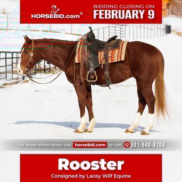 ❤️🔥𝑩𝒆 𝑴𝒊𝒏𝒆 𝐒𝐄𝐋𝐄𝐂𝐓❤️🔥 Happening now thru MONDAY | FEBRUARY 9th - Available EXCLUSIVELY on HorseBid's website! For more details and to register visit: www.Horsebid.com CONSIGNOR CONTACT: Lacey Wilf Equine 501-940-8704 LOCATION: Quitman, AR BREED: Quarter Horse REGISTERED: No REGISTERED NAME: Rooster COLOR: Sorrel HEIGHT: 15.1 AGE: 5 GENDER: Gelding Rooster is the kind that makes every day feel uncomplicated. A 5-year-old Quarter Horse gelding standing 15.1 hands, he wears a deep cherry red coat that turns heads, paired with four clean white socks and a bold blaze that give him undeniable presence. Good to be around on the ground and confident under saddle, he’s the kind of horse that settles a program the moment he steps into it. He’s been everywhere a real horse ought to go. Miles of trail in all kinds of weather, navigating rain, mud, water, and natural obstacles with a quiet, forward confidence. In town, he’s not phased by traffic, trains passing, or other distractions. He’s been used extensively at the stockyards and around cattle, opening and closing gates, loading trucks, sorting, and staying level-headed when things get busy. When winter rolls in, Rooster doesn’t miss a beat — he’s been ridden in the snow and even pulled a sled, taking it all in stride with the same steady willingness. In the arena, he’s handy and correct. He picks up both leads easily, carries a good handle, and sits down into a big, honest stop. He has the mind and foundation to excel as a rope horse, while remaining versatile enough to fit a wide range of programs and riders. He’s easy to catch, comfortable stalled or turned out, and gets along well with other horses. Simple to groom, tack, mount, and haul, stands tied without fuss, good with his feet, and currently barefoot with solid, healthy hooves. Rooster sells 100 percent sound. He’s the kind of gelding that fits seamlessly into a program and earns his keep from day one — steady, capable, and easy to rely on. Watch his full Youtube video, feel free to reach out with any questions, and arrange a visit or a FaceTime with Rooster!