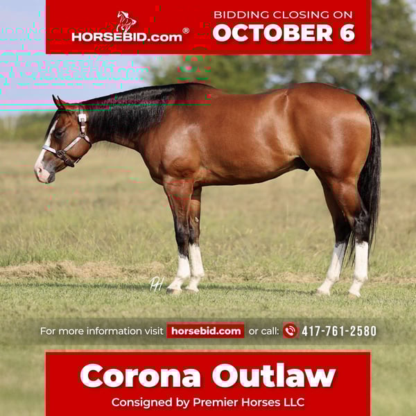 🍂 𝓐𝓾𝓽𝓾𝓶𝓷 𝑨𝑳𝑳 𝑺𝑻𝑨𝑹 𝑳𝑰𝑵𝑬𝑼𝑷 🍂 Happening now thru MONDAY | OCTOBER 6th - Available EXCLUSIVELY on HorseBid's website! For more details and to register visit: www.Horsebid.com CONSIGNOR CONTACT: Premier Horses LLC 417-761-2580 LOCATION: Buffalo, Missouri BREED: Quarter Horse REGISTERED: Yes REGISTERED NAME: Corona Outlaw COLOR: Bay HEIGHT: 15.2 AGE: 4 GENDER: Gelding Talk about loaded with talent, pedigree, and style! Corona is beaming with potential and ready for a job. They don’t come much fancier colored than him. A striking bay color with four white socks that are almost identical, a memorable blaze going down his face, and the kindest eyes. Check out his pedigree! He is a son of Cartels Feature (LTE: $19,000+) and offspring earnings of $500,000+. His dam side is unique, being old school foundation, pairs great on his sire. Corona is nothing short of a beautiful mover, he could accel at any job whether it be an excellent trail partner, fancy English, western performance, or even ranch work. He has long stride that makes for the smoothest trot and lope. Corona has experience going down the trails and is a joy to take. He goes through creeks or belly deep ponds. Go check the mail on him and take him down the roads, he is traffic safe. Corona goes up and down embankments with care and ease. He covers almost any type of terrain with cadence. He has been used to sort and gather cattle on a weekly basis, staying solid all day. We believe he would make anyone a fantastic partner in any discipline they desire!