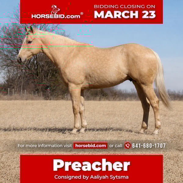 ⚜️𝓽𝓱𝓮 𝐆𝐎𝐋𝐃 𝓢𝓮𝓵𝓮𝓬𝓽⚜️ Happening now thru MONDAY | MARCH 23rd - Available EXCLUSIVELY on HorseBid's website! For more details and to register visit: www.Horsebid.com CONSIGNOR CONTACT: Aaliyah Sytsma 641-680-1707 LOCATION: Cincinnati, IA BREED: AQHA REGISTERED: Yes REGISTERED NAME: He’s Livin Ona Prayer COLOR: Palomino HEIGHT: 15.2 AGE: 5 GENDER: Gelding “Hes Livin Ona Prayer” 2020 model AQHA gelding standing 15.2 hands tall! He is also registered through the Palomino Horse Breeders Of America. This guy is super shapey, very well broke, personable, and a true joy to ride! Out on the trail Preacher is as reliable as they come! He goes the pace you ask, sure footed, crosses anything you put in his path, and aims to please! He’s level headed in the front, back, or middle of the pack! He doesn’t mind if another horse is right up behind him, and he won’t try to run into any trees. Down the road Preacher is traffic safe! Big semi’s, loud cars- he dosent bat an eye. In the arena he is BROKE! Collects into the bridle, takes his leads, pivots, side passes, ect. He has a lot of buttons and is super fun to ride! In the arena we do recommend an intermediate as he is soft and sensitive with his cues. Preacher has zero buck, bite, rear, or kick. He stands tied, saddles easy, loads well, he can be slightly goofy about bridling but just take your time and you won’t have any issues! Preacher does have an old scar on his front cannon bone but is 100% sound! If you’re looking for a solid trail mount and some fun in the arena this is your guy!