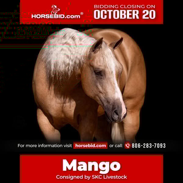♦️ 𝐭𝐡𝐞 𝐀𝐌𝐄𝐑𝐈𝐂𝐀𝐍 𝓕𝓪𝓵𝓵 𝓒𝓵𝓪𝓼𝓼𝓲𝓬 ♦️ Happening now thru MONDAY | OCTOBER 20th - Available EXCLUSIVELY on HorseBid's website! For more details and to register visit: www.Horsebid.com CONSIGNOR CONTACT: SKC Livestock 806-283-7093 LOCATION: Canyon TX BREED: Quarter Horse REGISTERED: Yes REGISTERED NAME: One Gear COLOR: Palomino HEIGHT: 15.2 AGE: 4 GENDER: Gelding Mango – Palomino Gelding | Well-Trained, Versatile, and Ranch-Ready Mango is sired by Shift N Gears a NRHA producing son of Gunnatrashya. Mango has a strong foundation in reining and the kind of solid, consistent training that makes him a pleasure to ride. He’s responsive, smooth, and broke in all the right ways. Mango has well-developed spins, soft and guided circles with natural cadence, and a long, ground-covering extended trot. His jog is comfortable and easy to sit, and he guides around on a loose rein or collected frame, willingly moving off your seat and leg without resistance. He’s been shown in Versatility Ranch classes and handles patterns, transitions, and trail obstacles with confidence. Mango is currently working on curbside mounting and continues to be receptive to new skills. His stop is solid, his leads are clean, and he rides with the kind of precision that comes from time and thoughtful training. Mango has been used on the ranch and has plenty of outside miles. He’s worked in the feedlot, sorted and doctored cattle, and has been part of multiple brandings in the fall. He’s quiet in the herd, soft in the bridle, and stays gentle through long days. Mango has also been trail ridden through Palo Duro Canyon and along the Canadian River, crossing water, brush, and rugged terrain with ease. He’s confident around wildlife—deer, antelope, pheasants—and doesn’t get rattled. Mango is quiet on the ground, easy to handle, and has been safe for our younger riders. He’s the kind of gelding that fits a variety of riders and jobs—steady, capable, and always dependable.