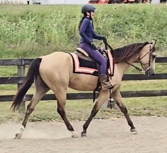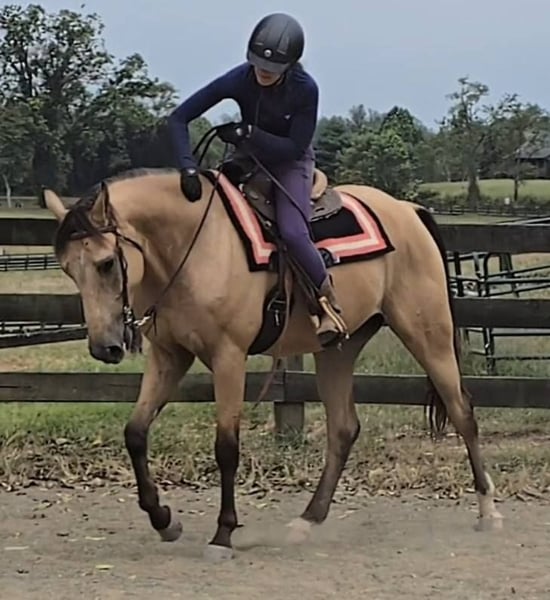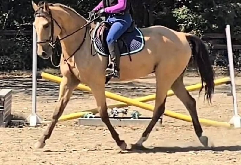 "AVAILABLE ON ONLINE HORSE AUCTION AT www DOT MagicHorseAuction DOT com BIDDING OPEN NOW thru TUESDAY | November 11TH! - BUY IT NOW AVAILABLE! *Final price will be determined on auction site* CONSIGNOR CONTACT INFO: Nicole Ingrassia 571-289-2947 LOCATION: Jeffersonton, VA "Ripple In Time, aka ""RIPLEY"" Ripley is a beautiful, eye-catching buckskin grade QH Appendix gelding. He stick measures at the perfect size of 15.3H, making him big enough for many sizes of riders while also being a manageable size for more petite riders as well! Ripley is 5 years old, coming 6, and he has his whole life ahead of him. This bright and promising gelding has already been lovingly trained in both Western and English disciplines. Ripley will 1-handed neck rein, pick up the canter from the walk, side-pass, has a great stop, and is responsive to cues from the seat, leg, to bit pressure and moves off the leg without needing spur or crop. Ripley is one of the most comfortable horses I have ever ridden! He is butterly smooth to ride, sitting his walk trot canter is like silk! In English tack, Ripley has a foundation in dressage, and is currently schooling training and first level. He loves having a job to do and does not get bored with arena work and he loves dressage! He is a gorgeous mover with a lovely flatkneed trot, and he will happily frame up onto contact or go on a loose rein. Ripley has also been trained over jumps, and he canters a lovely course of jumps with fillers and solid obstacles. He jumps out of stride and has a ""hunter round"" look to him and he is suitable to continue in the hunter ring if his new owner wishes. Ripley has very nice manners, is easy to catch, likes attention, and has no vices. He is easy to have around, not a hard keeper, and he is not on any maintenance. Ripley is healthy and sound and clean legged with no blemishes. He has not had any injuries or illnesses and he is healthy and UTD on vaccines, dental, deworming, farrier, and coggins. We have clean x-rays on file for Ripley available as a courtesy, and buyers are welcome to do their own PPE as well at their expense. Ripley loads in a trailer, ships, ties and cross-ties, lunges, bathes, is not afraid of clippers, gets along well with others in turn out, can be stalled or live out, and is a maintenance-free kind of guy. If you are looking for a quality, talented, sweet gelding, a buckskin on top of everything, don't miss out! Please reach out with any questions or if you would like to come ride him. We are also happy to assist with a video call with interested buyers. Don't miss out on the horse of your dreams!
