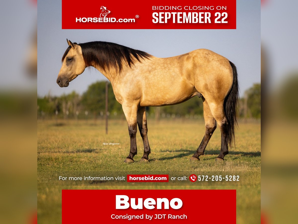 🍁𝒕𝒉𝒆 𝐅𝐀𝐋𝐋 𝑺𝒑𝒆𝒄𝒕𝒂𝒄𝒖𝒍𝒂𝒓🍁 Happening now thru MONDAY | SEPTEMBER 22nd - Available EXCLUSIVELY on HorseBid's website! For more details and to register visit: www.Horsebid.com CONSIGNOR CONTACT: Jdt Ranch 572-205-5282 LOCATION: Crescent, OK BREED: Aqha REGISTERED: Yes REGISTERED NAME: Buenos Dakota Jody COLOR: Buckskin HEIGHT: 15.3 AGE: 4 GENDER: Gelding What a gorgeous 4yr old we are proud to offer to the public! Meet bueno a 15.3 hand 1250lb stunning buckskin gelding! We are so pleased with this guy! He is an everyday employee here at the ranch and he had become a go to! He is true everyday full of try and an impeccable work ethic to him. He is soft and correct and respectful in every way and knows a true days work. He also has some of the prettiest movement I’ve seen in a long long time Hits the ground soft you never move in the saddle he would make an outstanding ranch trail or ranch class gelding . He has doctored pasture cattle pushed and shipped and checks pairs everyday . He has seen mile upon mile and is confident in himself. He is not a spooky or reactive horse very quiet . He is ready for his person and his career Go show him and win Go ranch on him Go trail ride! Anything your needing an equine partner for he is ready to step into those shoes He has a lifetime ahead of him Current x rays and is sound in every way! Please feel free to call or we can FaceTime so you can meet Bueno for yourself! Watch his video and enjoy! Megan 572-205-5282
