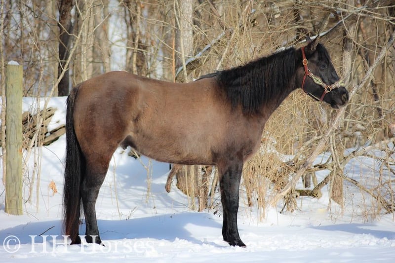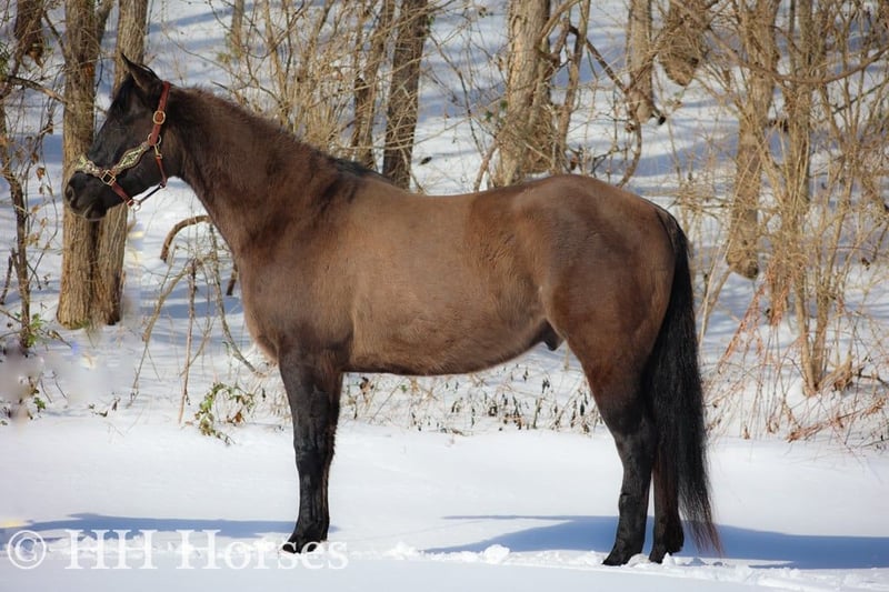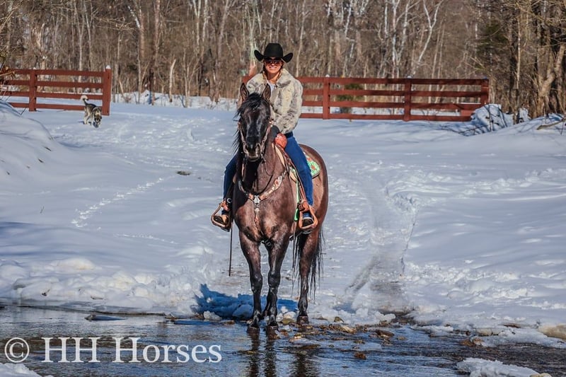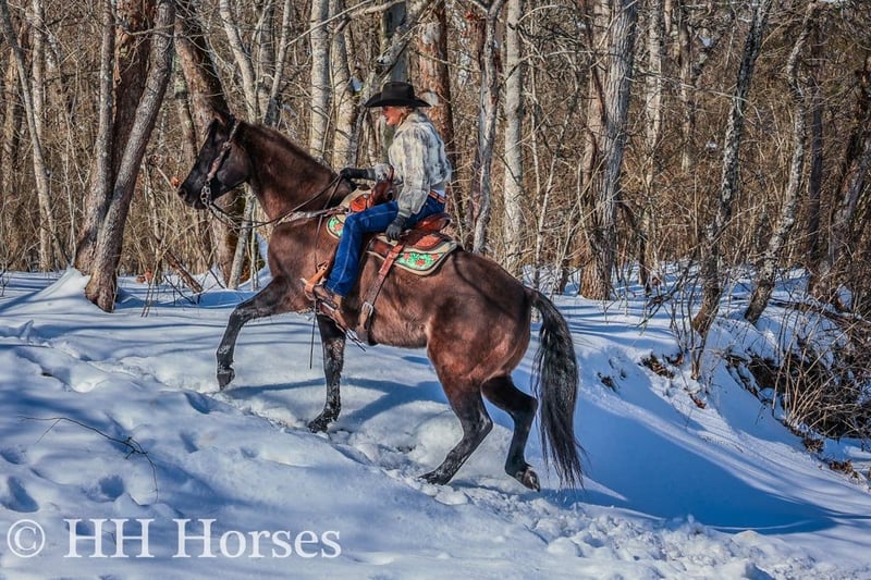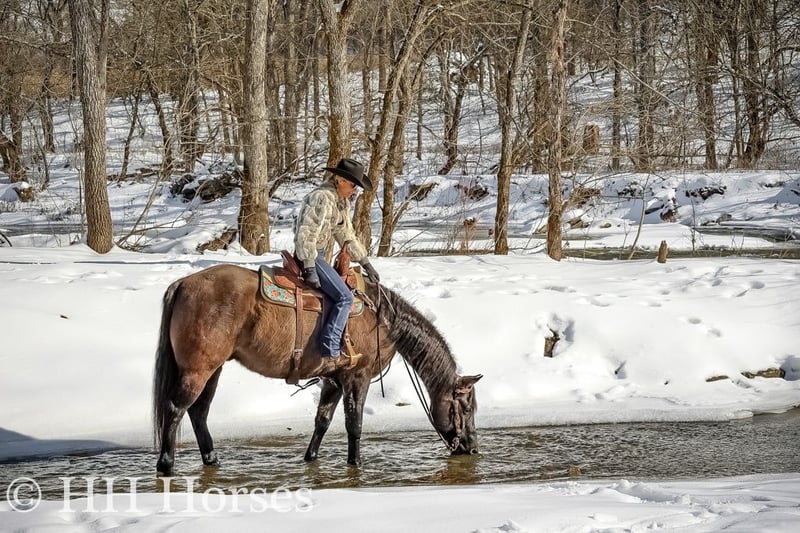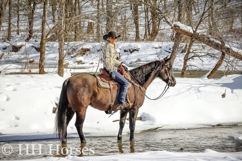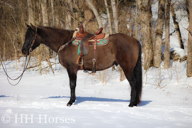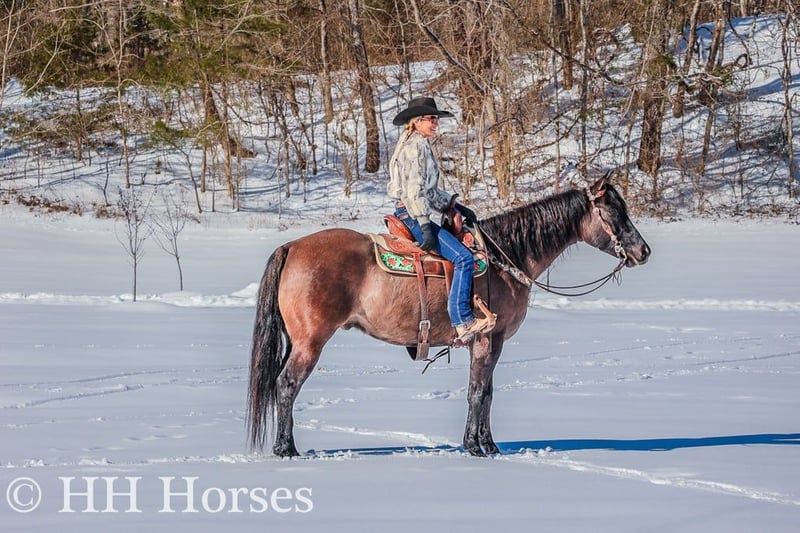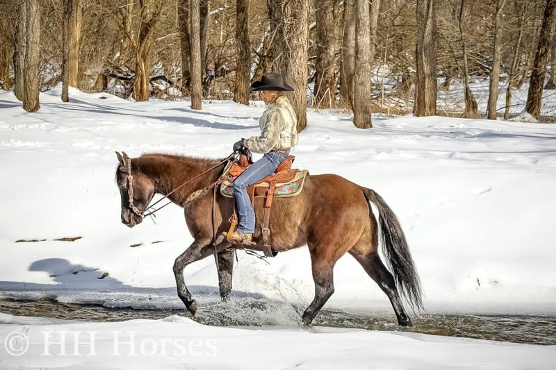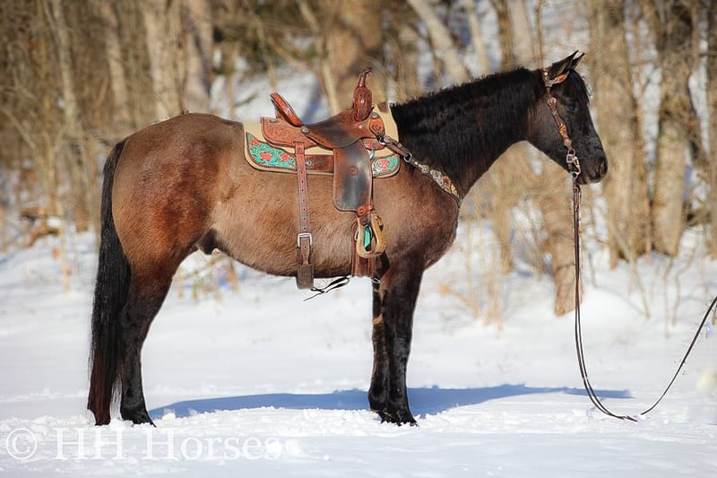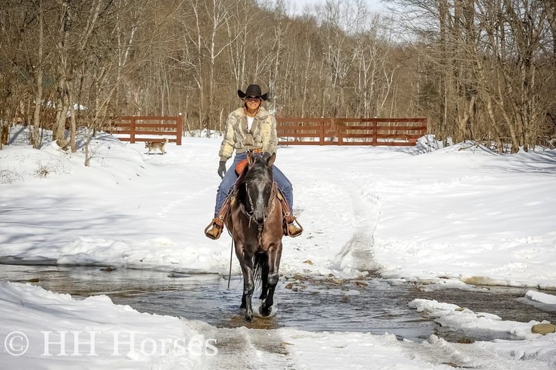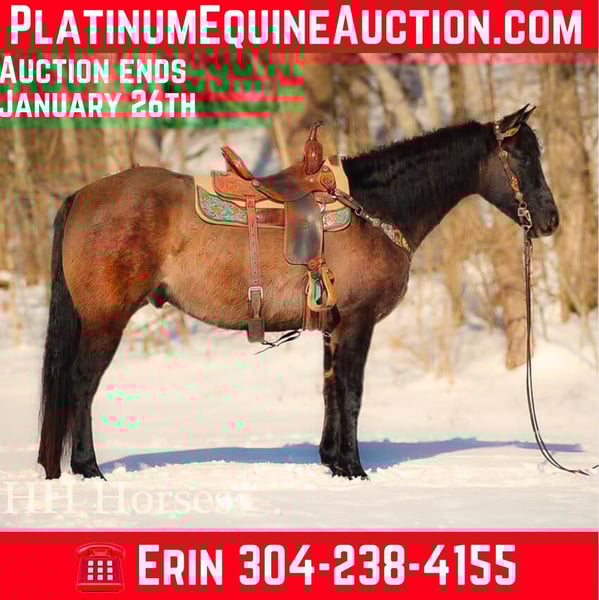ONLINE AUCTION Place your bids at www.PlatinumEquineAuction.com Starting Bid $3500 Auction ends January 26th, 2025 Need a new saddle? Check out White Rock Saddles on our website or Facebook! This is “ICE CHARLIE KISS LEO”, a gorgeous registered 2021 AQHA BLUE GRULLA GELDING that is gentle and quiet natured. This gelding is stout made, muscular, and stands 15.3 hands tall. He is coming 4 years old in April. This gelding has been ridden in the indoor and outdoor arenas. He will lope nice circles, stop easily on whoa, and he backs up. He also has been ridden outside on the trails and in the mountains. He is very well mannered and easy going. He has been through the deep water, on rough terrain, and ridden on snow and ice. He is sure footed, travels cautiously down steep embankments, and does not go any faster than you ask of him. He rides out alone courageously and will cross rushing water without hesitation. He is not spooky and fine with wildlife such a deer and turkey jumping out on the trails. He has also been on the road and is traffic safe. He has been around the skid steer in the barn and the side by sides. He will walk relaxed on a loose rein and is not nervous. He has excellent ground manners, stands tied, loads, bathes, and hauls with no issues. He is a super nice young gelding with the color, the look, the brains, and the athletic ability to go do whatever you want to do with him. He has an excellent foundation of training and is ready to go on with his new owners. He is the hard to find kind. For more info or to make a Buy It Now offer contact HH Horses Erin 304-238-4155 Located in Flemingsburg, KY