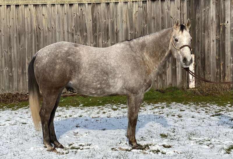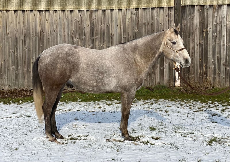 Sunny – 5-jarige Quarter Horse-stamper 🌟 Maak kennis met Sunny, een prachtige, stevig gebouwde, aankomende grijze ruin, ongeveer 1,60 m hoog, 5 jaar oud. Een echte eye-catcher met een eigen karakter die houdt van afwisseling. Sunny vindt eindeloze rondjes in de binnenbak eerder saai; hij houdt van buitenritten, grondwerk of een gevarieerd veelzijdigheidstraining en kalmte training. Daar is hij voor te porren. Een perfecte rustige partner voor buitenritten, tijd buiten doorbrengen, of het nu rijden, wandelen of gezamenlijke vakanties betreft. Hij is nog jong en leert snel. Hij heeft basis Western-opleiding gehad. Omdat hij en ik niet goed bij elkaar passen, is hij tot nu toe niet actief verder opgeleid. Er zit dus nog onbenut potentieel in hem, dat verder ontwikkeld kan worden. Hij heeft al enkele oriëntatieritten gemaakt. Sunny heeft een passende ruiter nodig, omdat hij soms wat eigenzinnig en zelfverzekerd kan zijn. Hij heeft een ruiter nodig met duidelijke ideeën, zelfvertrouwen en een plan. Als je dat kunt bieden, is hij een eerlijke en geweldige partner voor de vrije tijd. De laatste foto toont Sunny toen hij een paar dagen oud was, dus als palomino geboren. * Opleidingsniveau: Kent de binnenbak, buitenritten met andere paarden en heel graag ook solo. Een heel trouwe en betrouwbare partner. * Temperament: Absoluut relaxed, leergierig. * Geschikt voor: Ruiters die een buitenrijpartner zoeken die hen overal naartoe brengt (wandelruiter). Laden gaat helemaal probleemloos. Bij de smid ook braaf (momenteel beslagen). Volledig veilig in het verkeer. Ezels, tractor, vrachtwagen, bus, schapen enzovoort, alles geen probleem. Röntgenfoto’s aanwezig. Geen kreupelheid. Klinisch in orde. Hij wordt alleen geplaatst in een 5-sterren thuis met gezelschap en bij voorkeur dagelijks weidegang.