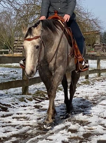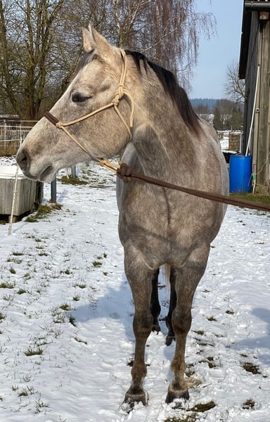 Sunny – potro de raza Quarter Horse de 5 años 🌟 Les presento a Sunny, un hermoso potro robusto y en camino a convertirse en gris, de aproximadamente 1,60 m de altura. Un auténtico imán con carácter propio, que disfruta de la variedad. A Sunny no le gustan las vueltas interminables en la pista de doma; prefiere paseos, trabajo en el suelo o entrenamiento de doma y doma natural en diferentes disciplinas. Le encanta la aventura. Es un compañero tranquilo y perfecto para paseos en la naturaleza, pasar tiempo al aire libre, ya sea montado o caminando, e incluso vacaciones conjuntas. Aún es joven y aprende rápidamente. Ha recibido formación básica en Western. Como él y yo no hemos conectado del todo, no ha sido entrenado de forma activa desde entonces. Por ello, aún tiene un gran potencial sin explotar, si se desea seguir desarrollándolo. Ya ha participado en algunos paseos de orientación. Sunny necesita un jinete que se adapte a su carácter, ya que a veces puede ser un poco testarudo y confiado en sí mismo. Requiere un jinete con ideas claras, confianza y un plan. Si se le puede ofrecer esto, será un compañero honesto y muy fiable para el ocio. La última foto muestra a Sunny cuando tenía unos días de edad, es decir, cuando nació como palomino. * Nivel de entrenamiento: Conoce la pista de doma, paseos en grupo y también disfruta de paseos en solitario. Es un compañero muy leal y confiable. * Temperamento: Tipo muy tranquilo, con muchas ganas de aprender. * Adecuado para: Jinete que busca un amigo para campo, que lo lleve a donde sea (paseos de aventura). No hay problema para cargarlo en remolque. También se porta bien con el herrador (actualmente en herradura). Totalmente seguro en el tráfico. Burros, tractores, camiones, autobuses, ovejas, etc., nada le asusta. Disponemos de radiografías. No presenta cojera y está clínicamente en perfectas condiciones. Se busca un hogar en un entorno de 5 estrellas, con compañía y preferiblemente con acceso diario a pasto.
