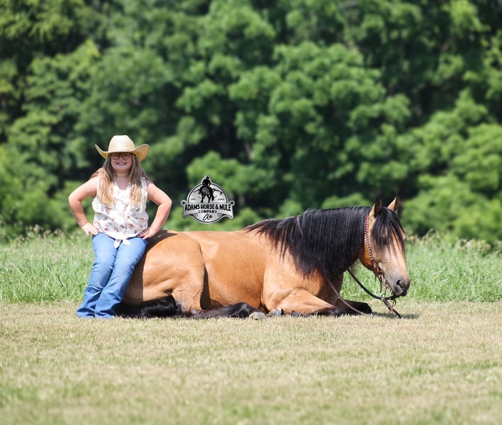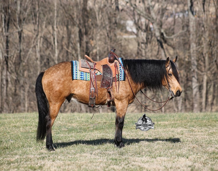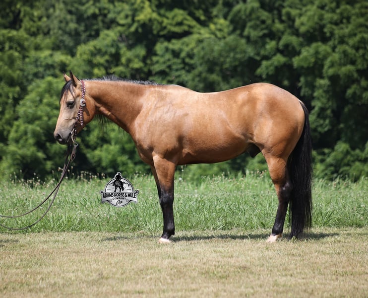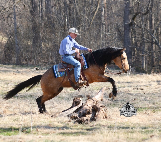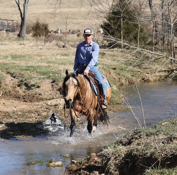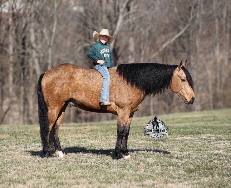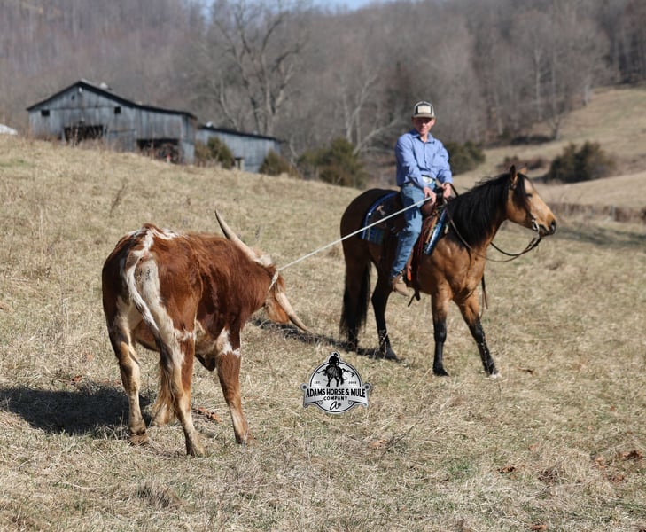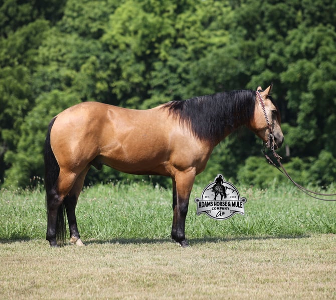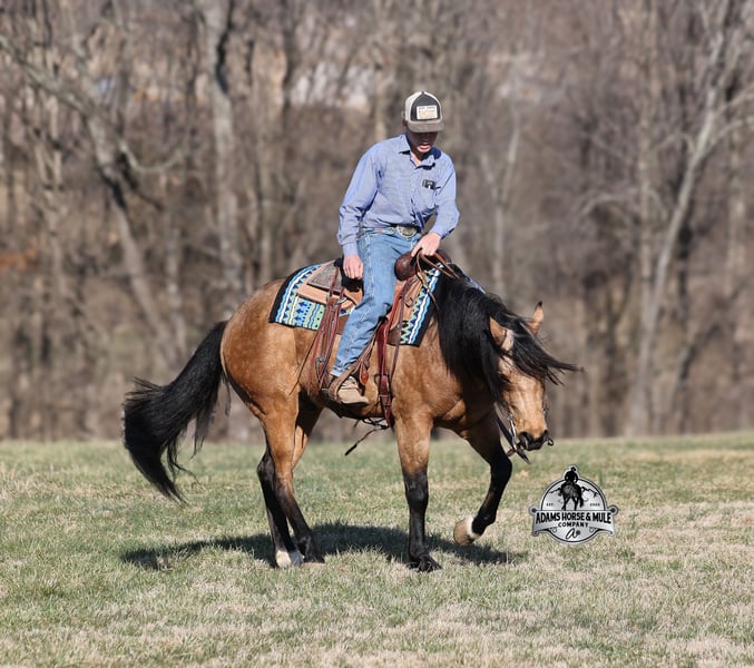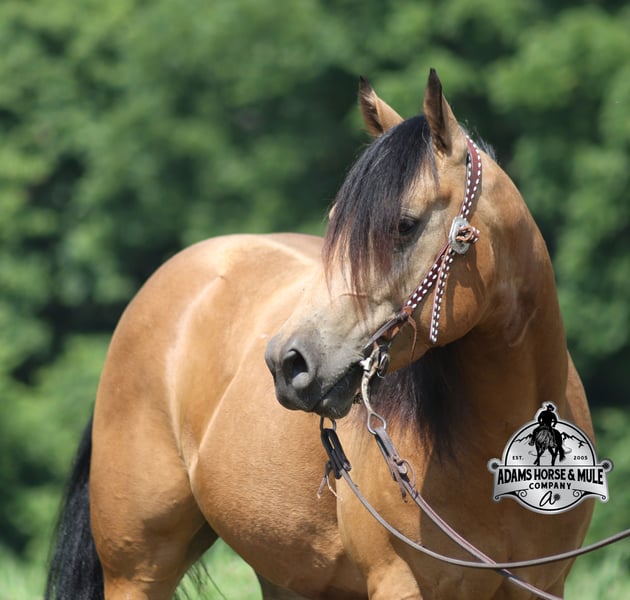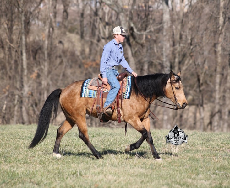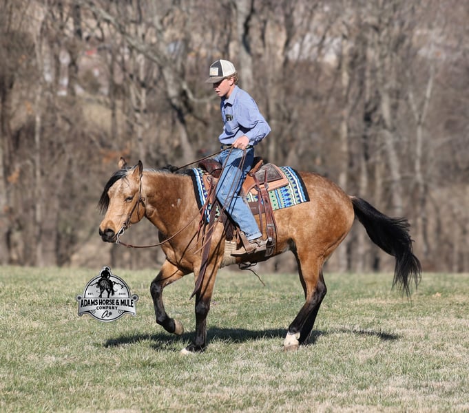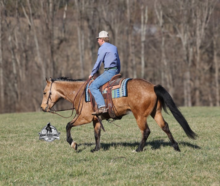 Royal Peppy is a very royal looking golden buckskin gelding with big dapples on him. He stands 14.2h, is a 2021 model, he looks great and rides great too! Peppy would be a great horse for Ranch Riding classes. He has been used out on the ranch in all aspect of ranch work including pasture roping. He has tracked the roping dummy as well. Peppy is totally user friendly to ride as he lopes slow and easy, with the reins draped, in perfect circles… He is very well trained and spins circles correctly both ways and slide stops… he has the moves to go along with the good looks! The one trait that he has more than anything is a BRAIN and he is super smart and super laid back and gentle. In fact he is one of the most quiet, safe and beginner/family friendly horses that is on our place! Over the last (almost) year of owning him there is one major thing that we do love about him and that is you can ride him daily or leave him pastured for months and he will still be the same horse every time that you step on him. Another cool thing about Peppy is that he knows some tricks and will lay down on command. From ranch work to trails if want to go for a relaxing ride just step on Peppy! Steep slopes, rocky terrain, creeks, logs, ditches… he crosses it all with ease and is never in a hurry! Peppy is a horse that can handle any task and can handle being ridden by the whole family from 7 to 87 years old will enjoy him! Eye appeal, Registered, Training, Experience, Versatility, Safety… He checks all the boxes! If you have any questions call Eric 606-308-2461. Go to visit our website for more pics and a video www.AdamsHorseAndMuleCo.com AHAMC has been in the horse business and sold horses over the internet since 2005. We have a long track record of success with hundreds of happy customers. We work hard to match riders with the correct horses and specialize in beginner safe, family friendly horses that have been used and checked out by our family! We can set up transportation anywhere in the US and look forward to working with you.
