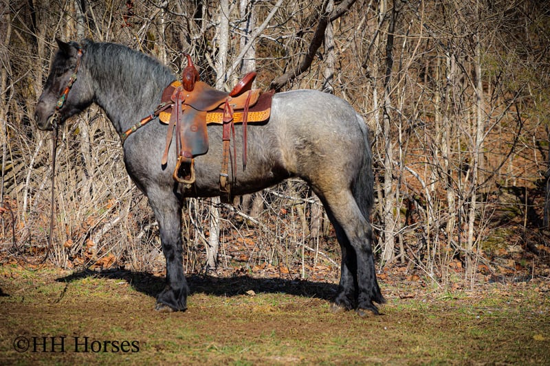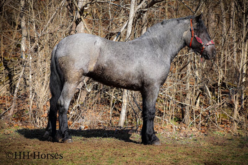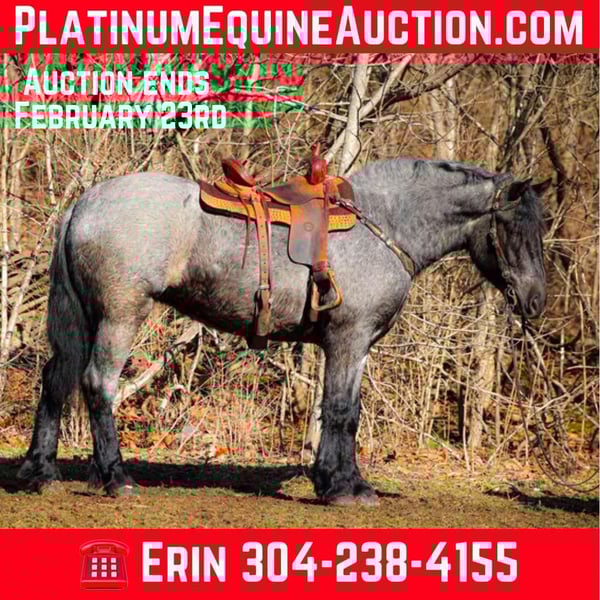 ONLINE AUCTION Place your bids at www.PlatinumEquineAuction.com Starting Bid $3500 Auction ends February 23rd, 2025 Need a new saddle? Check out White Rock Saddles on our website or Facebook! This is “MISS APPALACHIA”, a gorgeous, stout made, smart, strong yet gentle, well trained TRUE BLUE ROAN BRABANT MARE that is broke to ride and drive. This mare is not only well built with really cool color, but extremely intelligent, civilized, and nice to be around. She stands 15.3 hands tall and is 4 years old. She has been ridden English and Western in the indoor arenas and outdoor arenas. She has been out on the trails, through the water, ridden in the thick brush, through mud, ice, and snow. She has been on rocky mountainous terrain and handles it well. She is sure footed and stays in four wheel drive. It will not get too deep or too steep for her. We have taken her through the cross country driving courses and she will cross water quietly under tack or harness. She is brave, honest, solid, and sincere. She has been driven on the roads, in a few parades, and she is traffic safe. She is responsive and fun to ride with a big solid stop. She backs up and is loping circles in the arena. She will also ride out in the open and lopes off quietly with no hump and no buck. She stands to harness, hitch, tack, mount, and groom. She aims to please and has a great personality that makes her a pleasure. She is versatile, will hook up and work, drive a cart or wagon, and tack up and ride off nicely. Don’t miss out if you want a big cool TRUE BLUE BRABANT. Located in Flemingsburg, KY. For more info or to make a BUY IT NOW offer contact HH Horses Erin 304-238-4155. ONLINE AUCTION Place your bids at www.PlatinumEquineAuction.com Starting Bid $3500 Auction ends February 23rd, 2025 Need a new saddle? Check out White Rock Saddles on our website or Facebook!