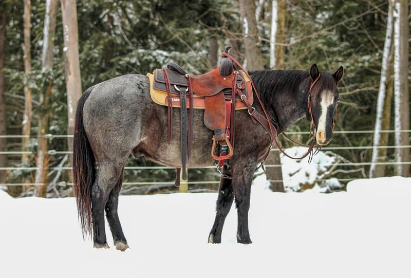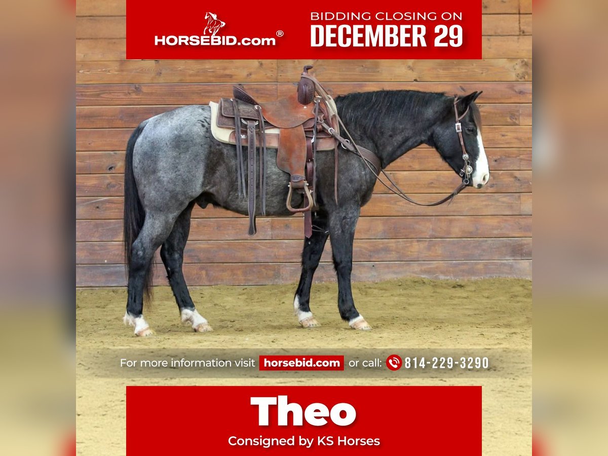 ⚜️ 𝓗𝓮𝓻𝓲𝓽𝓪𝓰𝓮 𝐖𝐢𝐧𝐭𝐞𝐫 𝓒𝓵𝓪𝓼𝓼𝓲𝓬⚜️ Happening now thru MONDAY | DECEMBER 29th - Available EXCLUSIVELY on HorseBid's website! For more details and to register visit: www.Horsebid.com CONSIGNOR CONTACT: KS Horses 814-229-3290 LOCATION: Clarion, PA BREED: QH REGISTERED: No COLOR: Blue Roan HEIGHT: 14.1 AGE: 5 GENDER: Gelding Theo is a 5 Year Old Blue Roan Quarter Horse Gelding. Standing 14.1 hands tall making him nice and easy to get on and get off but also stocky enough built to carry any size rider. Theo is the Total Package with safety and looks! He is the perfect fit for the whole family to ride and be around because he is so quiet and gentle in every way! He has been ridden into down and down the main streets and roads and is traffic safe. Been on many of trail rides and trail ridden in the rough terrain. Has been hauled to state parks and trail ridden. He was even ridden to the local drive in movie theatre. Theo rides very nicely in the arena and has a nice smooth walk , trot and canter and lopes nice circles each way hitting his correct leads. One hand neck reins, side pass and has nice head set and back up. Super Nice All Around Gelding! If you value your safety and been looking for that good broke all around horse dont miss out on Theo! We can help arrange delivery anywhere in the United States. Call or Text Kris at 814-229-3290. Thank You and God Bless