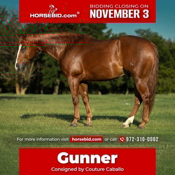 ⚜️𝐓𝐇𝐄 𝐅𝐀𝐋𝐋 𝐇𝐄𝐑𝐈𝐓𝐀𝐆𝐄 𝐂𝐋𝐀𝐒𝐒𝐈𝐂⚜️ Happening now thru MONDAY | NOVEMBER 3rd - Available EXCLUSIVELY on HorseBid's website! For more details and to register visit: www.Horsebid.com CONSIGNOR CONTACT: Couture Caballo 972-310-0002 LOCATION: Gainesville, TX BREED: AQHA REGISTERED: Yes REGISTERED NAME: VB Spook Gunner COLOR: Sorrel HEIGHT: 14.3 AGE: 5 GENDER: Gelding There’s quiet — and then there’s Gunner quiet. By the $7 Million Dollar Sire, Smart Spook, and out of a money-earning daughter of Colonels Smoking Gun ($14 Million Dollar Sire) — “Gunner” is the definition of what makes this cross so timeless. Predictable, consistent, and comfortable, he’s that classic Smart Spook gelding through and through. The kind that’s easy to be around, effortless to ride, and impossible not to love. Trained, useful, and genuinely kind, “Gunner” saddles up gentle every single time- whether he’s been off for a month or worked daily. He’s solid in all reining maneuvers, easy to change leads, and doesn’t require a “user manual” to operate. As an individual, he’s as morally sound as they come — never leaks to the barn, never buddy sour. Simple, soft, and responsive without ever being reactive, he doesn’t need a big bit or a long warm up to go do his job. One look in his eye tells you everything you need to know — he’s as trustworthy and pure hearted as they come. The kind that builds confidence, earns trust, and brings out the best in every rider. He knows the difference. “Gunner” is an experienced lesson horse, the one that makes you want to go ride. In September, he babysat kids at a busy ranch horse show, then earlier this month, Bar MB Ranch swung aboard to win the Novice Trail with a 73, place 2nd in Ranch Rail, Ranch Pleasure, and Reining, and finish just a few points shy of the Novice Horse High Point against a dense field of competition. When the showing wrapped, he quietly transitioned right back to babysitter duty — safely packing kids around all afternoon without missing a beat. Started in the box, used to drag calves to the fire, and confidently beginning in the breakaway, he carries the mind and composure of a seasoned eleven year old. Quiet. Sound. Solid. A true family horse — effortless, reliable, and all heart. No maintenance. No vices. UTD on all care. Selling with a fresh set of X-rays and vet statement. Offered exclusively by Couture Caballo, he’s the quiet confidence every rider deserves.. trained, trusted, and ready to go wherever you point him!
