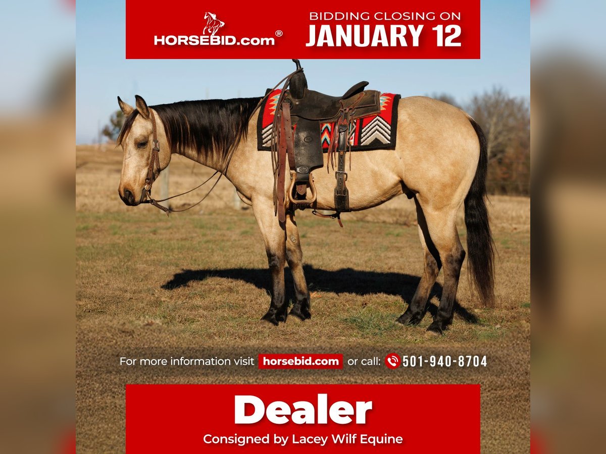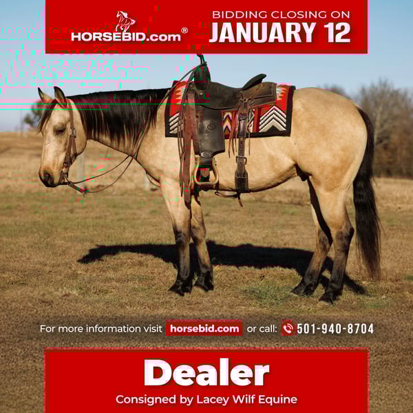 ♦️𝐍𝐄𝐖 𝐘𝐄𝐀𝐑'𝐒 𝑬𝒙𝒕𝒓𝒂𝒗𝒂𝒈𝒂𝒏𝒛𝒂♦️ Happening now thru MONDAY | JANUARY 12th - Available EXCLUSIVELY on HorseBid's website! For more details and to register visit: www.Horsebid.com CONSIGNOR CONTACT: Lacey Wilf Equine 501-940-8704 LOCATION: Quitman, AR BREED: Quarter Horse REGISTERED: Yes REGISTERED NAME: CD Dun Deal COLOR: Buckskin HEIGHT: 14.3 AGE: 6 GENDER: Gelding CD Dun Deal, known as Dealer, is a 14.3 hand 2020 model buckskin gelding whose ability is matched by a pedigree built on proven performance and longevity. Bred for feel, trainability, and versatility, he carries bloodlines that have shaped generations of successful arena and ranch horses. In the arena, Dealer shows the polish his lineage promises. He picks up both leads effortlessly, stops with authority, and turns with control and correctness. His handle is soft yet precise, allowing him to stay low, relaxed, and composed. He will ride collected when asked, yet is just as comfortable cruising on a loose rein, never elevating or losing rhythm. Dealer’s pedigree traces directly to Dun It Dealin, Dealn Dirty, and Smart Chic Olena, lines known for producing NCHA and NRHA money earners, elite reiners, cutters, and versatile all-around performers. On the bottom side, CD Olena, Doc Jehu, and Docs Royal Renee further reinforce his performance foundation—this is a pedigree built on substance, not trends. Outside the arena, Dealer has genuine trail experience, confidently navigating varied terrain with a steady, uncomplicated demeanor. He handles new environments with ease and maintains the same quiet consistency whether riding out alone or with company. Dealer’s disposition is one of his standout qualities. He is quiet and level-headed, yet exceptionally friendly and curious, with a genuine fondness for people. He seeks out interaction, enjoys attention, and brings an approachable presence both in and out of the saddle. His ground manners are impeccable—respectful, easy to handle, and uncomplicated in daily care. With his conformation, mind, and solid foundation, Dealer is a well-broke, ready-to-enjoy gelding that fits comfortably into a wide range of programs. He offers a forgiving, uncomplicated ride and transitions easily between jobs, making him an excellent choice for an amateur rider. Whether used in the arena, taken down the trail, or introduced to roping, Dealer delivers consistency, confidence, and a quiet willingness that makes him easy to live with and enjoyable every day.