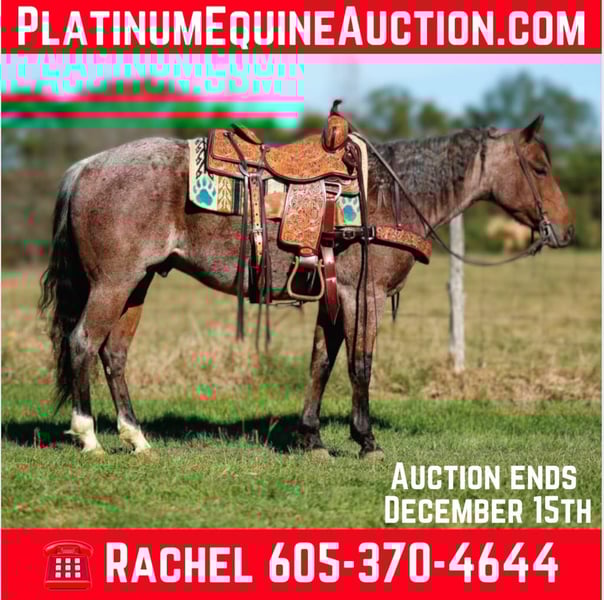ONLINE AUCTION Place your bids at www.PlatinumEquineAuction.com Starting Bid $3500 Auction ends December 15th, 2024 Need a new saddle? Check out White Rock Saddles on our website or Facebook! Sparkin With Pepto AKA Pepto is a coming 5 year old (2020 model) registered AQHA bay roan gelding, this super cute gelding stands 14.3 hands tall. Pepto is sweet and gentle to be around, he has a good start on him, he lopes nice circles in the arena and is soft in the face and easy to ride. Pepto has also been rode outside, he crosses the creeks and goes where you ask him. He has also been used for basic ranch work, he has been used to gather, pen and sort cattle!Pepto is very smart and willing to learn and would excel in any direction you choose to take him. He is located in Rusk TX, nationwide shipping is available! Call or text TR Livestock Rachel 605-370-4644 for more info. ONLINE AUCTION Place your bids at www.PlatinumEquineAuction.com Starting Bid $3500 Auction ends December 15th, 2024 Need a new saddle? Check out White Rock Saddles on our website or Facebook!
