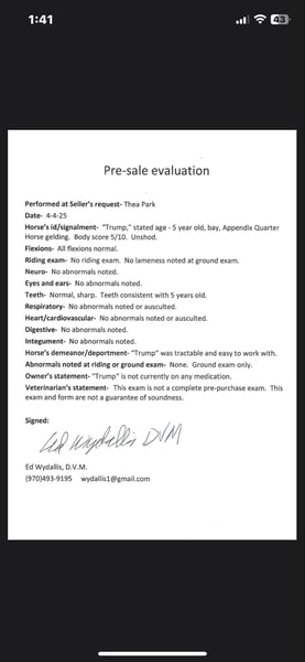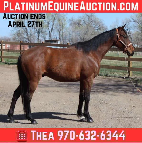 ONLINE AUCTION Place your bids at www.PlatinumEquineAuction.com Starting Bid $3500 Auction ends April 27th, 2025 Need a new saddle? Check out White Rock Saddles on our website or Facebook! Introducing Trump! Trump is a 5-year-old, 15 hand gelding with a heart of gold! This sweet and affectionate boy loves people and has amazing ground manners. He self-loads, backs out of the trailer with ease, and will stand tied all day without a fuss. He loves being bathed, is fantastic for both the vet and farrier, and has been barefoot his whole life! In the herd, Trump is an easygoing, low-ranking horse who gets along with everyone—horses and livestock alike. Trump is truly versatile, riding both English and Western with confidence. He looks absolutely adorable in an English saddle, knows his collection and leads, and is currently working on flying changes and cross rails. He’ll trot around on a loose rein, pick up a lope off a simple cluck or kiss, and will stop just from your voice. He also has the start of a neck rein! Trump will cross absolutely anything you put in front of him, water, bridges, tarps etc! He has a fun personality and is easy to be around! When it comes to trail riding, Trump is a total star! He’s surefooted and brave, handling rugged terrain with ease. Traffic, commotion, and new environments don’t phase him—he’s even been ridden through the drive-thru! Whether you’re looking for a reliable trail companion, a fun arena horse, or a laid-back partner with a big personality, Trump is as solid as they come. Check out his video to see just how special and versatile this guy truly is! Located in Fort Collins, CO. Contact Dynamite Horses Thea 970-632-6344 with any questions. ONLINE AUCTION Place your bids at www.PlatinumEquineAuction.com Starting Bid $3500 Auction ends April 27th, 2025 Need a new saddle? Check out White Rock Saddles on our website or Facebook!
