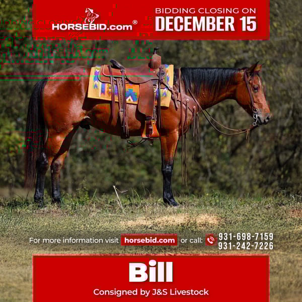 🎄𝐓𝐇𝐄 𝑯𝒐𝒍𝒊𝒅𝒂𝒚 𝐂𝐋𝐀𝐒𝐒𝐈𝐂🎄 Happening now thru MONDAY | DECEMBER 15th - Available EXCLUSIVELY on HorseBid's website! For more details and to register visit: www.Horsebid.com CONSIGNOR CONTACT: J&S Livestock 931-698-7159 or 931-242-7226 LOCATION: Santa Fe, TN BREED: Quarter Horse REGISTERED: Yes REGISTERED NAME: Colonel Oil Bill COLOR: Blood Bay HEIGHT: 15.1 AGE: 5 GENDER: Gelding Colonel Oil Bill, AKA “Bill” - simple yet so elegant, correct conformation and the most willing, mannerly demeanor you could ask for. This beautiful blood bay, 2020 model AQHA gelding stands 15.1 hands. This is the type of young gelding that you can faithfully call your go-to horse, the horse you trust to go out and use. The type of horse that has all the potential and correct mindset, along with quiet temperament to be that perfect family horse, the type that becomes part of the family and makes you his best friend. This gelding has the sweetest temperament, and kindest soul. Bill is always eager to learn and takes to new situations bravely and most importantly safely. On our farm bill has been exposed to many different situations- from just your leisurely trail rides to rough terrain- deep water, thick brush, steep and rocky hills, to noisy traffic up and down the highway, to even roaring farm equipment. We have used him to check fence and ride through our cattle. We’ve loaded a couple trucks out on him as well. Bill is a very smooth ride, he has a nice, smooth W/T/C all while keeping a level head. He stands to be mounted, saddled and bathed. He is gentle on or off his back. He’s just as confident solo as he is in a group. You can ride him western, english or even bareback if you prefer. Bill is a steady, reliable partner to have and to grow with. He has a recent PPE, and current coggins. We’d love to chat with you about any more questions on bill! JT (931)-698-7159 or Bailey (931)-242-7226