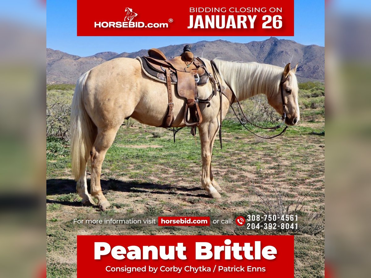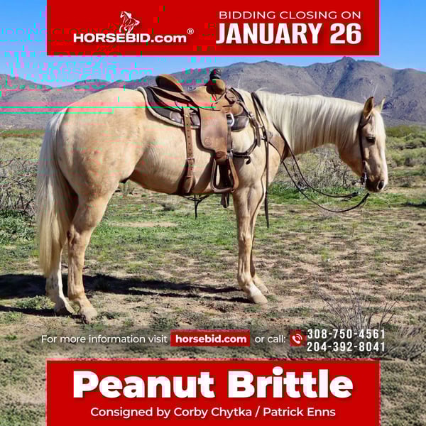 𝐉𝐀𝐍𝐔𝐀𝐑𝐘 ⭐️𝑨𝒍𝒍 𝑺𝒕𝒂𝒓 𝑳𝒊𝒏𝒆𝒖𝒑⭐️ Happening now thru MONDAY | JANUARY 26th - Available EXCLUSIVELY on HorseBid's website! For more details and to register visit: www.Horsebid.com CONSIGNOR CONTACT: Corby Chytka 308-750-4561 Patrick Enns 204-392-8041 LOCATION: Wickenburg, AZ BREED: Quarter horse REGISTERED: Yes REGISTERED NAME: Golden Diamon Jack COLOR: Palomino HEIGHT: 15.1 AGE: 6 GENDER: Gelding Peanut Brittle - 6 year old AQHA gelding. Stands 15.1 We have been riding this horse for several months now. He is any easy mover and has now developed skills where we could see him going in any direction. He has exposure to ranch and arena work. Outside riding seems therapeutic to him. He will trail behind any horse and isn’t pushy but will also ride off by himself with his head down and doesn’t spook. He has a good start roping live cattle on both the heading and heeling side. When he is in the box, he is looking for the cow before the gate even opens. He has the willingness and athleticism to excel on either end. Peanut brittle is going to make a great prospect for his future owner! He loves baths and being pampered. He is the horse that is going to take you wherever the wind blows and will look good doing it. So, if it’s being competitive in the arena or trail riding on a Sunday he will be your guy!