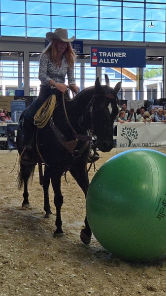 Schweren Herzens biete ich meinen 6-jährigen Quarter Horse Wallach „Duke“ zum Verkauf an. Duke ist ein echtes Unikat: lackschwarz mit einem markanten weißen Abzeichen an der Stirn, ca. 1,56 m Stockmaß – ein echter Hingucker mit hervorragender Abstammung. Seine Mutter ist eine Tochter des bekannten Hengstes With Technique(DQHA Hall of Fame). Ich habe Duke mit zwei Jahren direkt vom Züchter gekauft (inkl. DQHA-Papiere) und ihn seither behutsam und konsequent nach dem Pat Parelli Natural Horsemanship-Programm ausgebildet. 2024 und 2025 war er jeweils drei Monate im renommierten Savvy Center Schweinfurt bei Joshua Burke, wo er nun auf Parelli Level 4ausgebildet ist – sowohl am Boden als auch unter dem Sattel. Duke geht sehr gerne ins Gelände hier ist er sicher und geht gerne vorne weg. Duke ist ein Left Brain Extrovert – intelligent, neugierig und voller Energie. Er liebt Herausforderungen, braucht regelmäßige geistige wie körperliche Beschäftigung und ist daher nicht für Anfänger, Kinder oder unsichere Reiter geeignet. In erfahrenen Händen jedoch ist er ein absolut verlässlicher Partner – ob im Gelände (nervenstark), bei der Arbeit am Rind, Trail oder mit der Cutting-Maschine. Unser Duke durfte 2025 sogar auf der Americana dabei sein! Er wurde täglich zweimal im Showring von Parelli unter einem Working Student vorgestellt und überzeugte dort durch Gelassenheit, Aufmerksamkeit und Zuverlässigkeit. Besonders stolz sind wir darauf, dass er auch in der großen Abendshow am Donnerstag mit Pat Parelli teilnehmen durfte. Trotz ungewohnter Lichter, der großen Menge an Zuschauern und der besonderen Atmosphäre hat er sich absolut souverän, gehorsam und aufmerksam präsentiert. Duke zeigt sich damit als Pferd, das auch unter außergewöhnlichen Bedingungen Ruhe und Vertrauen bewahrt – ein verlässlicher Partner mit Nervenstärke und toller Ausstrahlung. Gesundheit: Frisch geimpft Zähne Anfang 2025 gemacht Chiropraktische Behandlung 2025 Anfällig für Husten – symptomfrei mit nassem oder sehr staubfreiem Heu (dies muss gewährleistet werden) Wichtig: Duke wird nur in erfahrene Hände abgegeben, die bereit sind, ihn weiterhin nach dem Parelli-Konzeptzu fördern und zu fordern. Optional: Passender Sattel (WoW Round Reiner 59/16, Bioleder Honig mit Büffelleder-Seat) kann auf Wunsch mit erworben werden. Preis nach Absprache – Platz vor Preis! Duke ist für mich ein echtes Herzenspferd, und ich wünsche mir für ihn ein Zuhause, in dem er geliebt, verstanden und gefördert wird. Der Verkauf findet im Savvy Center statt- darüber läuft auch der Erstkontakt.