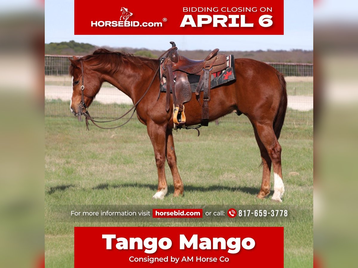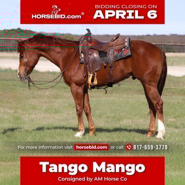 🌟𝑨𝒑𝒓𝒊𝒍 𝐀𝐋𝐋 𝐒𝐓𝐀𝐑 𝐋𝐈𝐍𝐄𝐔𝐏🌟 Happening now thru MONDAY | APRIL 6th - Available EXCLUSIVELY on HorseBid's website! For more details and to register visit: www.Horsebid.com CONSIGNOR CONTACT: AM Horse Co 817-659-3778 LOCATION: Mineral Wells, TX BREED: AQHA REGISTERED: No COLOR: Sorrel HEIGHT: 15.2 AGE: 6 GENDER: Gelding Tango Mango is one in a million, the kind of horse that can never be replaced. He is 15.2hh tall and gorgeous! At just 6 years old, he has his whole life ahead of him. Tango is a very gentle horse and on a scale of 1 to 10, he’s a -2 on quietness, gentleness and temperament. He is one of those all around geldings that are forgiving enough for those complete beginner riders but he is also fun for an advanced! You can’t go wrong with him for your family! He has had lots of experience working cattle on the ranch and has lots of trail miles under his belt. Tango is an excellent trail mount and also rides in the arena very nicely. He will one hand neck rein, good stop, back up and a slow smooth rocking chair lope. There isn’t anything he can’t do! He has been around wildlife, blowing tarps, heavy equipment, barking dogs, and lots of other crazy! He loves getting attention, to be groomed and he loves his baths. This gelding loads/unloads in the trailer with ease and will stand tied up all day like a gentleman. You can spend one second with this guy and know how special he is, come see him for yourself, or we can arrange hauling anywhere Worldwide! He is located at our ranch in Mineral Wells Texas. Please call or text 817-659-3778 for serious inquiries!