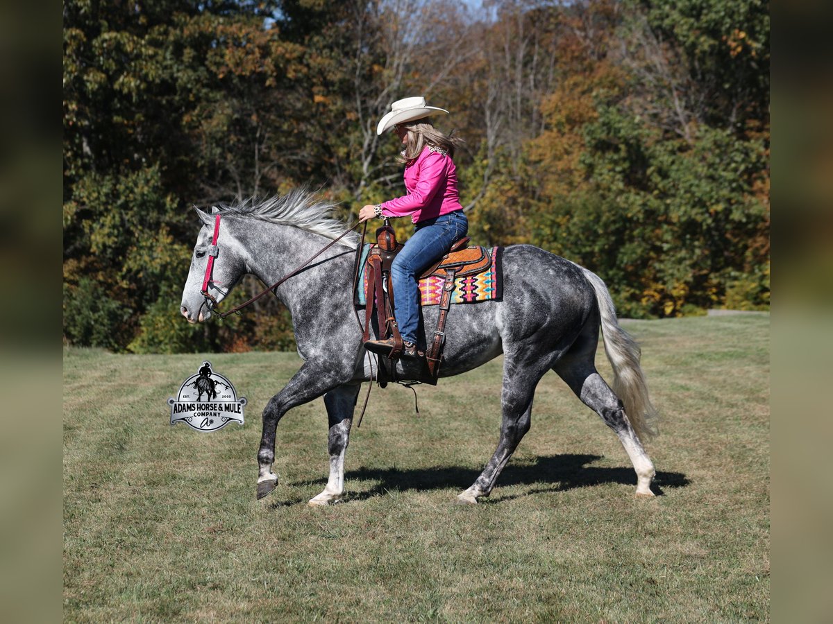 He is consigned to the COWGIRL CADILLACS Sale in Wickenburg, AZ on February 20-21st. You can bid online or bid in person. There is a preview day before the sale or you can come ride him prior to the sale in Mt. Vernon, KY. Register to bid at www.CowgirlCadillacs.com More info at www.AdamsHorseAndMuleCo.com $10000 starting bid He’s got dapples the size of apples! SK Drifters Chrome is a 15.2h, dapple grey, 2020 model reg AQHA gelding with a coat that looks as if it is chrome plated! Chrome is a big gentle love bug that is everyone’s best friend! He has never met a stranger and he loves attention and with looks like his… he gets attention everywhere that he goes! Chrome has an excellent pedigree that consists of famous horses such as Sun Frost and Dash TA Fame! Chrome has been ridden around the ranch, he has pasture roped and doctored sick ones. We have hauled Chrome to the rodeos where he has sorted, penned and loaded the bulls. The kids have used him for pony rides and he has been ridden by all ages. The lights, speakers and crowds do not phase him at all! Chrome has been ridden by our kids down the trails, he is safe and not spooky at all! He has carried them over rough terrain, through deep water, deadfall, steep slopes… he is a steady Eddie out on the trails and is very laid back and safe! He has been camping in multiple states from Iowa to Tennessee. Chrome is gentle and easy to ride. He lopes nice circles, reins around both ways, has a good stop and reverse. He has been ridden English and been over the jumps, showing talent in that discipline. Chrome is not spooky around tarps, wind dancers, bull whips and gun fire as well. If you want a horse that is versatile, family safe, experienced, well trained, has a good pedigree… oh and don’t forget pretty… Chrome is the perfect pick for you!!! Chrome is available to ride and see in Mt. Vernon, KY until the week of the sale Feb. 16-21. Call for more info or if you have any questions 606-308-2461. Go to visit our website for more pics and a video www.AdamsHorseAndMuleCo.com AHAMC has been in the horse business and sold horses over the internet since 2005. We have a long track record of success with hundreds of happy customers. We work hard to match riders with the correct horses and specialize in beginner safe, family friendly horses that have been used and checked out by our family! We can set up transportation anywhere in the US and look forward to working with you. He is consigned to the COWGIRL CADILLACS Sale in Wickenburg, AZ on February 20-21st. You can bid online or bid in person. There is a preview day before the sale or you can come ride him prior to the sale in Mt. Vernon, KY. Register to bid at www.CowgirlCadillacs.com More info at www.AdamsHorseAndMuleCo.com $10000 starting bid