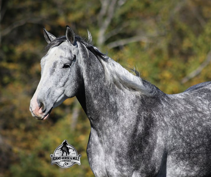 He is consigned to the COWGIRL CADILLACS Sale in Wickenburg, AZ on February 20-21st. You can bid online or bid in person. There is a preview day before the sale or you can come ride him prior to the sale in Mt. Vernon, KY. Register to bid at www.CowgirlCadillacs.com More info at www.AdamsHorseAndMuleCo.com $10000 starting bid He’s got dapples the size of apples! SK Drifters Chrome is a 15.2h, dapple grey, 2020 model reg AQHA gelding with a coat that looks as if it is chrome plated! Chrome is a big gentle love bug that is everyone’s best friend! He has never met a stranger and he loves attention and with looks like his… he gets attention everywhere that he goes! Chrome has an excellent pedigree that consists of famous horses such as Sun Frost and Dash TA Fame! Chrome has been ridden around the ranch, he has pasture roped and doctored sick ones. We have hauled Chrome to the rodeos where he has sorted, penned and loaded the bulls. The kids have used him for pony rides and he has been ridden by all ages. The lights, speakers and crowds do not phase him at all! Chrome has been ridden by our kids down the trails, he is safe and not spooky at all! He has carried them over rough terrain, through deep water, deadfall, steep slopes… he is a steady Eddie out on the trails and is very laid back and safe! He has been camping in multiple states from Iowa to Tennessee. Chrome is gentle and easy to ride. He lopes nice circles, reins around both ways, has a good stop and reverse. He has been ridden English and been over the jumps, showing talent in that discipline. Chrome is not spooky around tarps, wind dancers, bull whips and gun fire as well. If you want a horse that is versatile, family safe, experienced, well trained, has a good pedigree… oh and don’t forget pretty… Chrome is the perfect pick for you!!! Chrome is available to ride and see in Mt. Vernon, KY until the week of the sale Feb. 16-21. Call for more info or if you have any questions 606-308-2461. Go to visit our website for more pics and a video www.AdamsHorseAndMuleCo.com AHAMC has been in the horse business and sold horses over the internet since 2005. We have a long track record of success with hundreds of happy customers. We work hard to match riders with the correct horses and specialize in beginner safe, family friendly horses that have been used and checked out by our family! We can set up transportation anywhere in the US and look forward to working with you. He is consigned to the COWGIRL CADILLACS Sale in Wickenburg, AZ on February 20-21st. You can bid online or bid in person. There is a preview day before the sale or you can come ride him prior to the sale in Mt. Vernon, KY. Register to bid at www.CowgirlCadillacs.com More info at www.AdamsHorseAndMuleCo.com $10000 starting bid