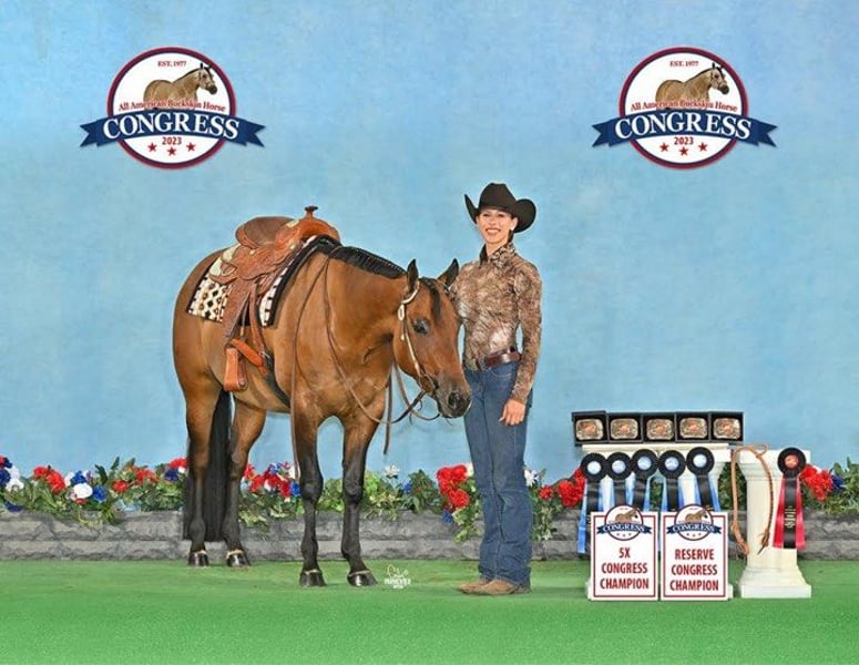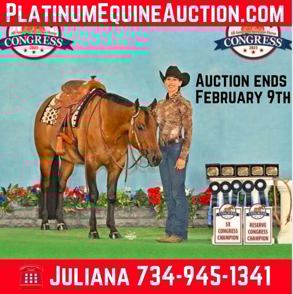 ONLINE AUCTION Place your bids at www.PlatinumEquineAuction.com Starting Bid $3500 Auction ends February 9th, 2025 Need a new saddle? Check out White Rock Saddles on our website or Facebook! Ramona Dun Did It Aka Reba is a 2020 registered AQHA/NSBA/IBHA/ABRA 15.2 hand mare looking for a new home! Don’t let her age fool you; she’s done it all with a quiet, easy-going personality! She has shown all around the last two years, everything from trail to showmanship. Reba could easily switch and excel in the ranch division. She has been leased out to junior and high school equestrian team students for the last two years; the kids love her! Easy keeper, no vices, and no maintenance. Ridden in parades as a 3yo for my high school students during homecoming season and has continued participating in multiple parades since. 5x Buckskin Congress champion 2023. Register of Merit and Honor Roll awards from ABRA. GLBA Queen Horse 2023. Has been started over low fences. Also been on trails. Negative Coggins and UTD on shots and worming. Teeth were done in the spring. Located in Jackson, MI. Contact Juliana Juback 734-945-1341 with any questions. ONLINE AUCTION Place your bids at www.PlatinumEquineAuction.com Starting Bid $3500 Auction ends February 9th, 2025 Need a new saddle? Check out White Rock Saddles on our website or Facebook!