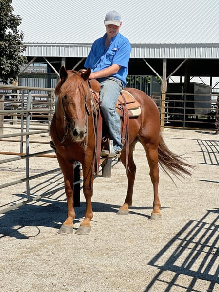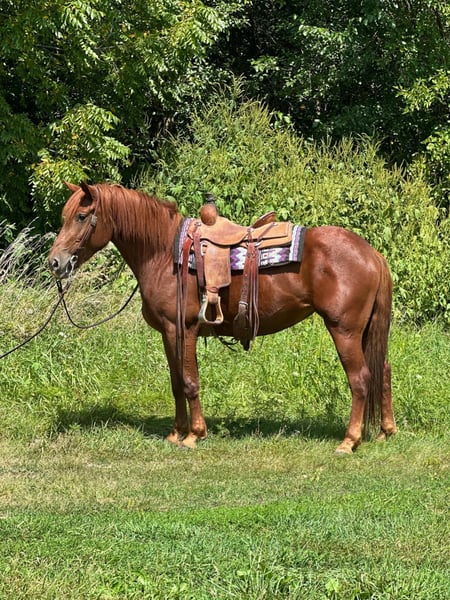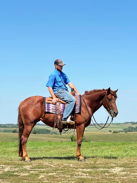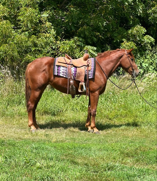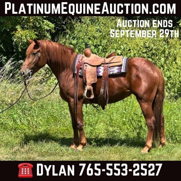 ONLINE AUCTION Place your bids at www.PlatinumEquineAuction.com Starting Bid $3500 Auction ends September 29th, 2024 Need a new saddle? Check out White Rock Saddles on our website or Facebook! Ruby is a 4 year old 16hh solid made cross bred mare. Ruby is out of a quarter horse mare and a Belgian stud. Ruby has been extensively trail rode and overnight camped on throughout the Midwest. She is very easy to get along with, loves attention and easy to catch. Ruby offers a nice flowing trot and rocking chair lope. She is good for both the vet and farrier. Ruby does good in a box stall or turned out. She offers a can do attitude with a nice handle. Ruby has checked fence all summer and been coonhunted on some this spring. Ruby has ponied and halter broke alot of colts. Loads and unloads like one should. Tacks up the same every ride. Ruby would excile in English or western. Soft in the bridle and ready to go on with! Sound and up to date on all cares. For further information please reach out to Dylan Landon 765-553-2527. Located in Van Horne, IA ONLINE AUCTION Place your bids at www.PlatinumEquineAuction.com Starting Bid $3500 Auction ends September 29th, 2024 Need a new saddle? Check out White Rock Saddles on our website or Facebook!