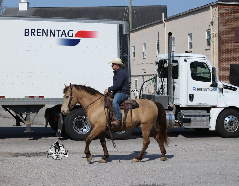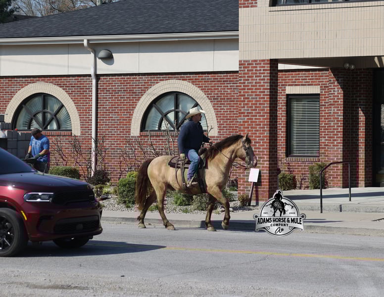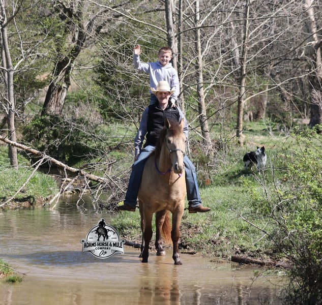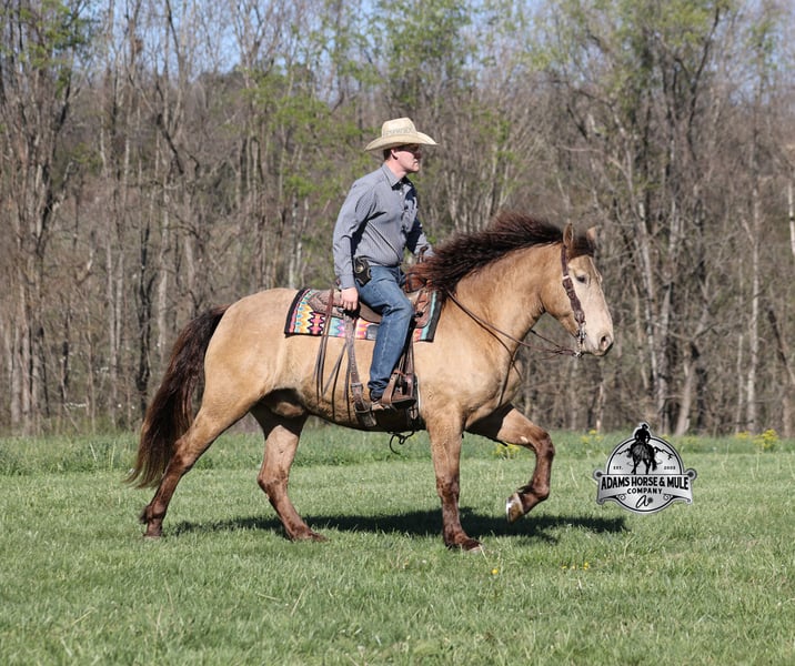 Go to visit our website for more pics and video link at www.AdamsHorseAndMuleCo.com AHAMC has been in the horse business and sold horses over the internet since 2005. We have a long track record of success with hundreds of happy customers. We work hard to match riders with the correct horses and specialize in beginner safe, family friendly horses that have been used and checked out by our family! We can set up transportation anywhere in the US and look forward to working with you. It’s time for a celebration… pop the champagne with this magnificent 15.2H+, ULTRA RARE Champagne Draftcross gelding! He is 6 years old and is VERY sturdy built. Jagger is one that is not only a rare color but rarely do we see one that is this beginner safe, a total confidence builder and one that is the PERFECT horse for the ENTIRE Family! He has been ridden by all ages including our kids. Jagger is one that does a little bit of everything… He’s been ridden around the ranch, checked cows and rode fences. Jagger is a trail riding machine!!! He is never in a hurry as he eases along down the trails, he will cross creeks, ditches, logs and navigate rough rocky areas. He picks the safest route and takes his time in tight situations. He has been exposed to all kinds of wildlife and has even packed will game out of the mountains. He is safe in traffic whether that be trucks or cars. He has a nice jog, his lope is smooth as well and he lopes nice circles! He is very well harness broke, pulls all farm implements and carriages as well. Jagger has been ridden English and geos over the rails with ease. This one horse that we can never say enough good things about and after he becomes part of your family your will agree! Feel free to call Eric 606-308-2461 with any questions!