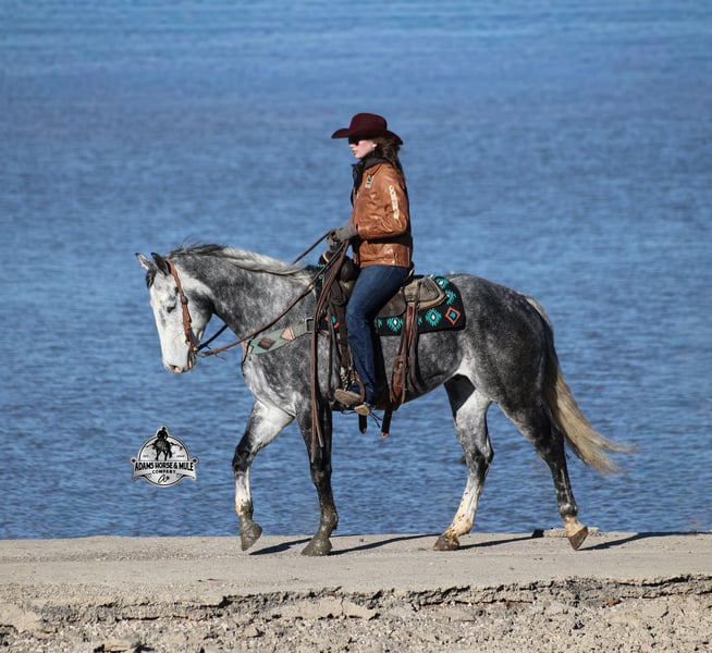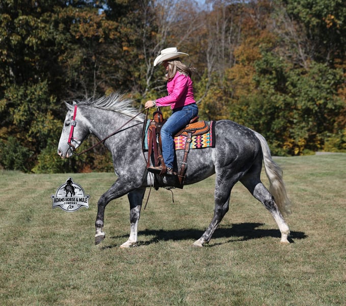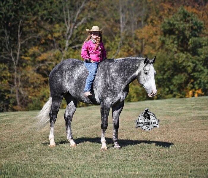 He is consigned to the COWGIRL CADILLACS Sale in Wickenburg, AZ on February 20-21st. You can bid online or bid in person. There is a preview day before the sale or you can come ride him prior to the sale in Mt. Vernon, KY. Register to bid at www.CowgirlCadillacs.com More info at www.AdamsHorseAndMuleCo.com $10000 starting bid He’s got dapples the size of apples! SK Drifters Chrome is a 15.2h, dapple grey, 2020 model reg AQHA gelding with a coat that looks as if it is chrome plated! Chrome is a big gentle love bug that is everyone’s best friend! He has never met a stranger and he loves attention and with looks like his… he gets attention everywhere that he goes! Chrome has an excellent pedigree that consists of famous horses such as Sun Frost and Dash TA Fame! Chrome has been ridden around the ranch, he has pasture roped and doctored sick ones. We have hauled Chrome to the rodeos where he has sorted, penned and loaded the bulls. The kids have used him for pony rides and he has been ridden by all ages. The lights, speakers and crowds do not phase him at all! Chrome has been ridden by our kids down the trails, he is safe and not spooky at all! He has carried them over rough terrain, through deep water, deadfall, steep slopes… he is a steady Eddie out on the trails and is very laid back and safe! He has been camping in multiple states from Iowa to Tennessee. Chrome is gentle and easy to ride. He lopes nice circles, reins around both ways, has a good stop and reverse. He has been ridden English and been over the jumps, showing talent in that discipline. Chrome is not spooky around tarps, wind dancers, bull whips and gun fire as well. If you want a horse that is versatile, family safe, experienced, well trained, has a good pedigree… oh and don’t forget pretty… Chrome is the perfect pick for you!!! Chrome is available to ride and see in Mt. Vernon, KY until the week of the sale Feb. 16-21. Call for more info or if you have any questions 606-308-2461. Go to visit our website for more pics and a video www.AdamsHorseAndMuleCo.com AHAMC has been in the horse business and sold horses over the internet since 2005. We have a long track record of success with hundreds of happy customers. We work hard to match riders with the correct horses and specialize in beginner safe, family friendly horses that have been used and checked out by our family! We can set up transportation anywhere in the US and look forward to working with you. He is consigned to the COWGIRL CADILLACS Sale in Wickenburg, AZ on February 20-21st. You can bid online or bid in person. There is a preview day before the sale or you can come ride him prior to the sale in Mt. Vernon, KY. Register to bid at www.CowgirlCadillacs.com More info at www.AdamsHorseAndMuleCo.com $10000 starting bid