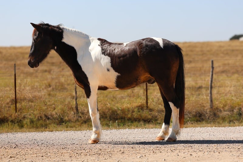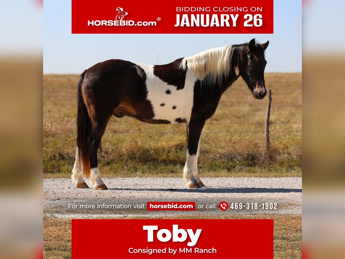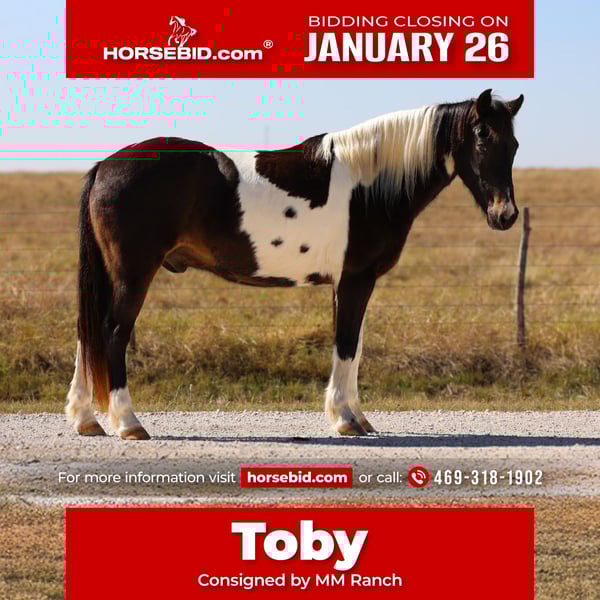 𝐉𝐀𝐍𝐔𝐀𝐑𝐘 ⭐️𝑨𝒍𝒍 𝑺𝒕𝒂𝒓 𝑳𝒊𝒏𝒆𝒖𝒑⭐️ Happening now thru MONDAY | JANUARY 26th - Available EXCLUSIVELY on HorseBid's website! For more details and to register visit: www.Horsebid.com CONSIGNOR CONTACT: MM Ranch 469-318-1902 LOCATION: Forney, TX BREED: Quarter Horse REGISTERED: No REGISTERED NAME: Toby COLOR: Tobiano HEIGHT: 13.3 AGE: 7 GENDER: Gelding Toby is the perfect little fun size horse standing 13.3 hands tall. He is only 7 years old but you wouldn’t be able to tell by how gentle he is! He has manners and rides around like a big horse, he’s as broke as broke gets and I would trust him with any kid, small adult, grandma or grandpa or any age beginner. Absolutely NO kick or buck in him! Absolutely no bad habits! Absolutely no maintenance or special care. He is simple, easy, and fun to ride. He has been more miles and seen more country than most people! When I say he’s been there and done that I mean it, he knows what a hard days work is outside in the country and will last all day. He is one handed broke, neck reins, and has a good stop! He has always been willing to go or do anything they have asked. He will ease thru the creeks/ponds, thickets, traffic safe, train safe, machinery safe, loud noises don’t bother him. He’s been to ropings, barrel races, has jumped jumps, rodeos, spent many of long days working cows, dragging calves, swimming ponds, tied out camping, and been thru every aspect of the woods from thickets to boggy creeks, and trail riding down the roads. He even rides ENGLISH! He will easily lope or trot over small jumps and is a very pretty mover. Toby has also been used to carry the American flag at rodeos. He is BOMBPROOF, not spook and will go anywhere he is pointed, he never refuses or says no. He is a once in a lifetime time little horse. ☀️ He is one of those that is as honest as the day is long. He’s easy to catch, bathe, and hauls like a champ. He has the biggest heart and try of anything we have on the place. The kids themselves, saddle, bridle, and ride him everywhere with ZERO help from an adult. I trust this little horse enough for little kids to run up to him from the front or back and he will stand like a rock. 🪨 You can go rope on him, run barrels, run poles, goats tie, TRICK RIDE, breakaway, and trail ride! Toby will walk, trot, lope, or go as fast as you want in all the events! He is the coolest little guy around and everywhere we go he gets ALL the attention. He leads, loads, ties, bathes, clips, and stands for the farrier. I really can’t say enough good things about him. Please don’t hesitate to call us about Harrison, I’d love to talk to you about him. ⚡️He sells 100% safe and sound in every way. 🌎 We can help with making shipping arrangements to anywhere!!