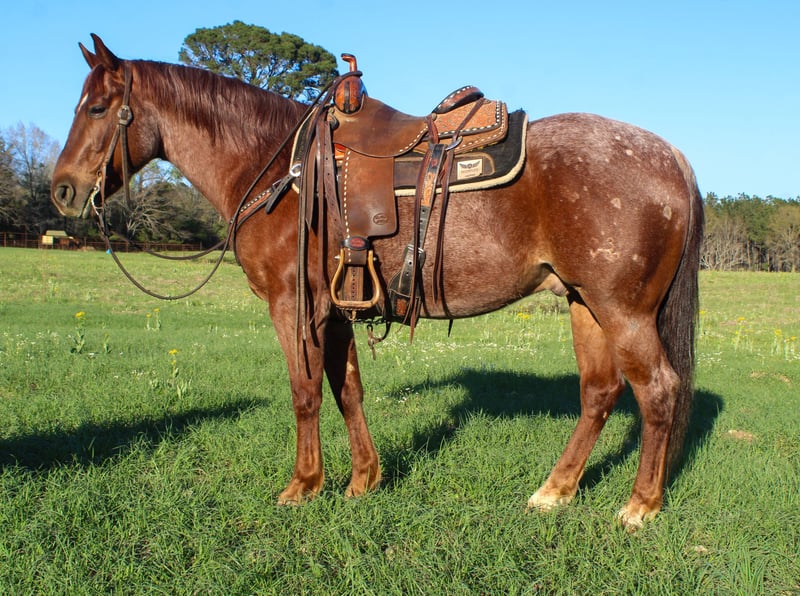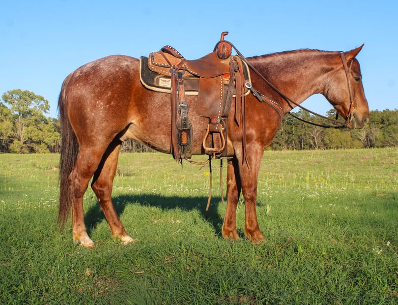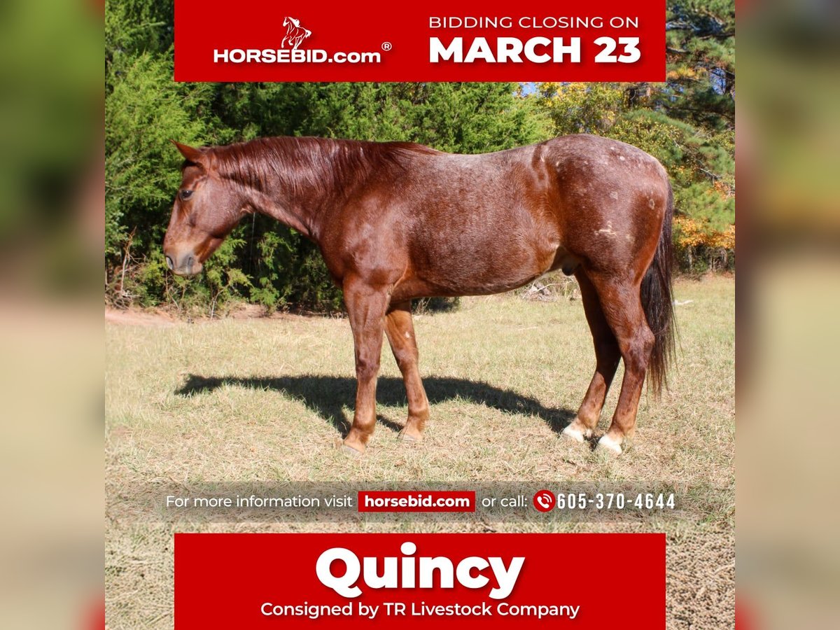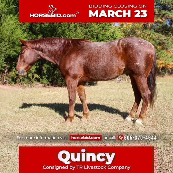 ⚜️𝓽𝓱𝓮 𝐆𝐎𝐋𝐃 𝓢𝓮𝓵𝓮𝓬𝓽⚜️ Happening now thru MONDAY | MARCH 23rd - Available EXCLUSIVELY on HorseBid's website! For more details and to register visit: www.Horsebid.com CONSIGNOR CONTACT: TR Livestock Company 605-370-4644 LOCATION: Rusk TX BREED: AQHA REGISTERED: Yes REGISTERED NAME: Candy wright on COLOR: Red roan HEIGHT: 14.2 AGE: 7 GENDER: Gelding Candy Wright On AKA Quincy is a 7 year old AQHA red roan gelding, standing 14.2 hands tall. He is an own son of NRCHA World Champion Hes Wright On. He has been shown in reined cowhorse as a 5 year old and was year-end Reserve Champion. He is quick footed and fast when asked. Not only has Quincy had a great career in the arena thus far he has also been rode outside a lot! He goes anywhere you point the reins without hesitation, through water, over obstacles, and any type of terrain. In the arena, He has a soft trot and a rocking chair lope. Great transitions and easy cues, makes him so easy to enjoy! He has great spins, pick ups a lope from a stand still, side pass over logs, etc. He could easily go show in the Ranch classes, is suitable for the youth and amateur in the reining cow horse as well! He has always been great with us, whether he had a month or a week off! Back at the barn, he is a favorite, he is a great pasture mate! He stands for the farrier and picks up all 4 feet with ease! He has good ground manners and will stand all day long. Not only is Quincy very broke he is safe! He has been rode by all ages and levels of riders, he is suitable for absolutely anyone. He has great turn arounds and flying changes. Would make a great team sorting or penning horse, continue to show him in the reining cow horse, ranch riding or even the trail classes or just trail ride him and ranch on him! Quincy is sure to make a great addition to anyone’s family! 📍Quincy is located in Rusk Texas. (Nationwide shipping is available!) 🐴PPE’s welcomed at buyers expense! ☎️Please call Rachel with any questions! 605-370-4644