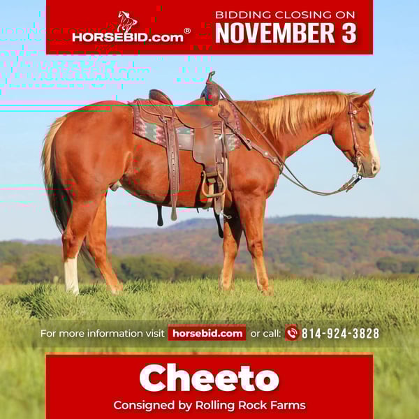 ⚜️𝐓𝐇𝐄 𝐅𝐀𝐋𝐋 𝐇𝐄𝐑𝐈𝐓𝐀𝐆𝐄 𝐂𝐋𝐀𝐒𝐒𝐈𝐂⚜️ Happening now thru MONDAY | NOVEMBER 3rd - Available EXCLUSIVELY on HorseBid's website! For more details and to register visit: www.Horsebid.com CONSIGNOR CONTACT: Rolling Rock Farms 814-924-3828 LOCATION: Miola, PA BREED: Quarter horse REGISTERED: No COLOR: Sorrel HEIGHT: 14.3 AGE: 6 GENDER: Gelding Cheeto is a 6 year old sorrel Quarter Horse gelding standing 14.3 hands tall, and he is every bit as kind and trustworthy as they come. He is the definition of a babysitter, making him an exceptional choice for a youth, beginner, or anyone wanting a quiet, dependable partner. Cheeto has the sweetest personality and genuinely enjoys attention. He is gentle to handle, easy to catch, and always meets you at the gate. In the arena, Cheeto is well broke and responsive to all cues. He rides soft in the bridle, carries a pretty headset at both the trot and lope, catches both of his leads with ease, and neck reins beautifully. He willingly side passes to open and shut gates, stops and backs easily, and always aims to please. He stands quietly in cross ties to be saddled, brushed, or bathed, and has excellent ground manners. On the trail, Cheeto is steady, confident, and sure footed. He is a true point and go type that takes everything in stride. He will walk through water, navigate rough terrain, and handle obstacles with complete ease. Whether you are riding out alone or with a group, he stays calm and dependable every step of the way. Cheeto has the perfect balance of being gentle and forgiving without being dull. He has just enough go to make him fun to ride while still being safe for less experienced riders. This gelding is the kind you can trust to take care of anyone in the family and enjoy in or out of the arena. If you would like to check out Cheeto or have any questions please feel free to contact Ethan at (814) 924-3828