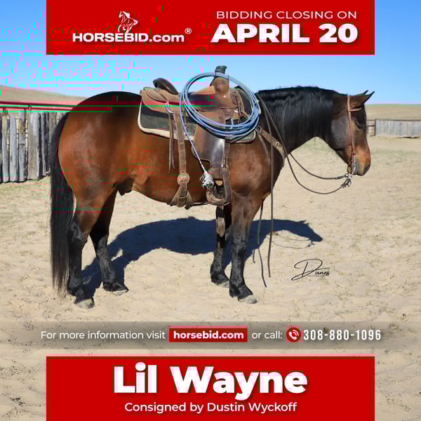 ⚜️𝐭𝐡𝐞 𝓔𝓵𝓲𝓽𝓮 𝐒𝐩𝐫𝐢𝐧𝐠 𝐂𝐥𝐚𝐬𝐬𝐢𝐜⚜️ Happening now thru MONDAY | APRIL 20th - Available EXCLUSIVELY on HorseBid's website! For more details and to register visit: www.Horsebid.com CONSIGNOR CONTACT: Dustin Wyckoff 308-880-1096 LOCATION: Broken Bow, NE BREED: Quarter Horse REGISTERED: Yes REGISTERED NAME: BURNIN SOPHISTICATT COLOR: Bay HEIGHT: 14.3 AGE: 7 GENDER: Gelding Lil Wayne is a VERY stout made 7 year old bay gelding who is an own son of Sophisticated Catt. That pedigree alone speaks for itself! He stands 14.3 and easily weighs 1100 pounds, and he certainly isn’t lacking in the muscle department! He is barefoot the whole way around, sound, sane and gentle. We have Lil Wayne going quite well on the heel side as well as breakaway. He is quick, gritty, and buries his butt when he stops. He is rock solid in the box, scores great, and isn’t one to get hot. He can take the practice runs you need, and is easy to practice on behind the heelomatic. He is a phenomenal prospect, and is ready to season this spring if you’re looking for your next rodeo partner. Lil Wayne has seen many ranch miles as well. He has long trotted the Sandhills gathering pairs, crossing water, sorting, and branding. He has drug his fair share of calves to the fire at branding. He is easy to ride ah our go to when we need reliable and experienced. Lil Wayne would fit anyone ready to expand their roping career on one you can finish your own way, or would make the perfect addition to your ranch if you are needing a well built gelding that has all the hard work behind him. Or, take him and enjoy him on the trails and know he will take care of you! If you have any questions, do not hesitate to reach out any time. We are happy to schedule a time for a test ride of this nice gelding! Dustin Wyckoff 308-880-1096 Broken Bow, Nebraska