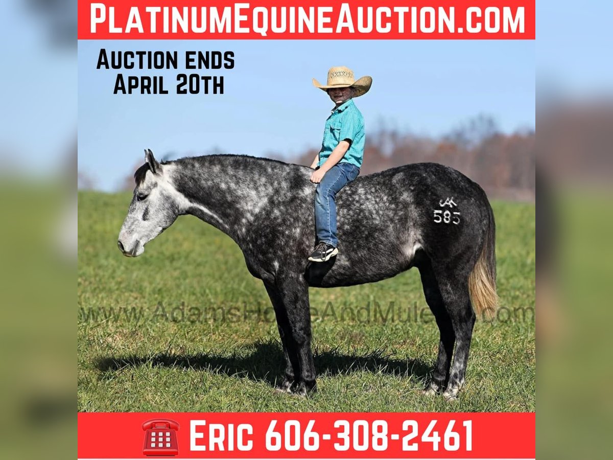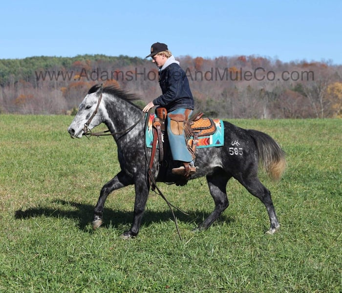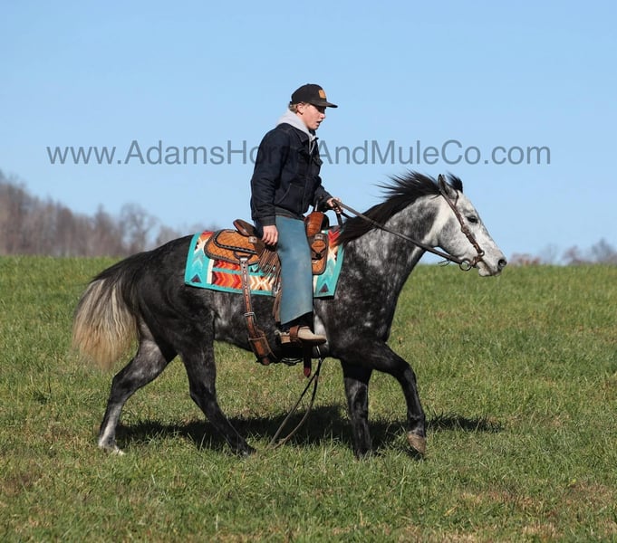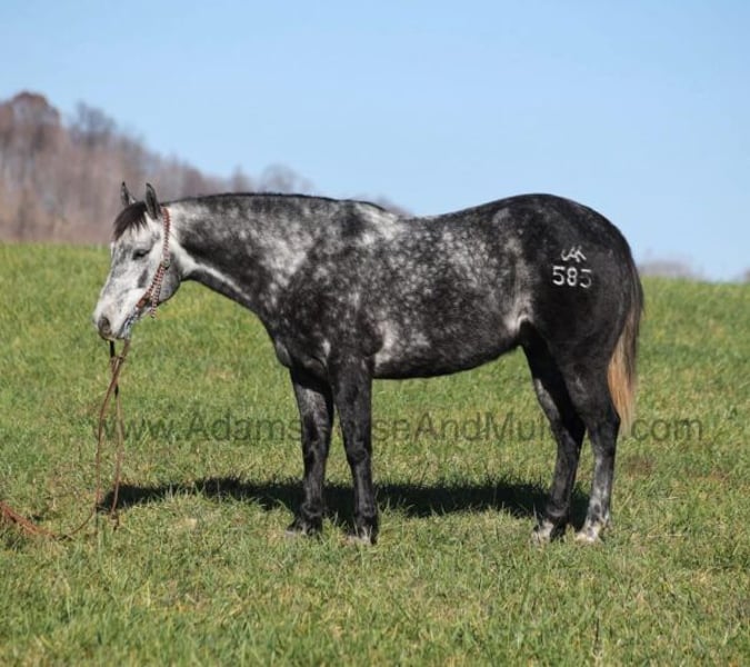 ONLINE AUCTION Place your bids at www.PlatinumEquineAuction.com Starting Bid $3500 Auction ends April 20th, 2025 Need a new saddle? Check out White Rock Saddles on our website or Facebook! AJak Mr Val Star 585 aka Val is a beautiful Dapple Grey that is very stout built, standing 14.3hh and he is a 2019 Model Registered AQHA Gelding! We have had a lot of these “Jak” horses that are bred and raised on the Oleen Brothers Ranch out in Kansas and every one of them that we have had are always gentle, good minded horses that are great for trails and ranch work. Val is no exception to that trend! He is a gentle type of horse that is never in a hurry! He lopes nice circles, catches the correct leads, has a good stop and reins around. Val just eases along down the trail and loves going on trail rides. He will cross creeks, ditches, logs and navigate rough rocky areas. Val has been exposed to all kinds of wildlife and will go anywhere that he is asked too. He has been rode many miles in the mountains and encountered every obstacle possible on the trail. He will go up or down even the steepest slopes, across deep creeks, over downed trees, and over all types of rough terrain while still being sure footed. Val has been ridden down the highways and is traffic safe as well. Val has been used around the ranch, he has sorted, penned and pasture roped. If you need a broke, quiet, gentle, safe horse for ranch or trails… Val is your guy! Call Adams Horse & Mule Co. Eric 606-308-2461 with any questions or to make a Buy It Now Offer. Located in Mt. Vernon, KY. ONLINE AUCTION Place your bids at www.PlatinumEquineAuction.com Starting Bid $3500 Auction ends April 20th, 2025 Need a new saddle? Check out White Rock Saddles on our website or Facebook!