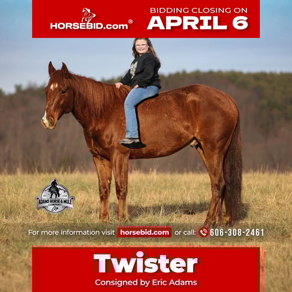 🌟𝑨𝒑𝒓𝒊𝒍 𝐀𝐋𝐋 𝐒𝐓𝐀𝐑 𝐋𝐈𝐍𝐄𝐔𝐏🌟 Happening now thru MONDAY | APRIL 6th - Available EXCLUSIVELY on HorseBid's website! For more details and to register visit: www.Horsebid.com CONSIGNOR CONTACT: Eric Adams 606-308-2461 LOCATION: Mt. Vernon, KY BREED: AQHA REGISTERED: Yes REGISTERED NAME: Uptown Twisted Drift COLOR: Chestnut HEIGHT: 15 AGE: 7 GENDER: Gelding When you walk onto a car lot everyone sees the fancy shiny Lincoln, Tesla or Cadillac setting at the entrance… but not everyone sees the muddy 4×4 setting around back that will get the job done, is a lot easier to operate and will start with no issues when its below 0 degrees!!! Uptown Twisted Drift aka Twister is that 4×4! He is reliable, always easy to ride, does any job that is asked of him and he still has all of the buttons! Twister is a chestnut Registered Quarter Horse Gelding, standing 15h, that is a 2019 Model. Twister is a well traveled horse that has been ridden in many states from Oregon to Montana and Texas to Kentucky. He knows all about the ranch life, from herding to sorting, pasture roping, riding the feedyard… he has done it all! If your confidence is low and needs a boost, he is the one for you! He is great in the trails and has been in the high country that is very rough and rocky. He will cross creeks, ditches, logs and navigate rough rocky areas. He will go up or down even the steepest slopes, across deep creeks, over downed trees, and over all types of rough terrain while still being sure footed. Twister has a smooth jog and a very smooth lope! He takes the correct leads, lopes nice circles, is one hand broke and reins around with ease. Twister has been ridden by our kids and is safe for the whole family! If you are over buying a flashy colored horse and now want one that is reliable and safe… Twister is the one for you! If you have any questions call Eric 606-308-2461.