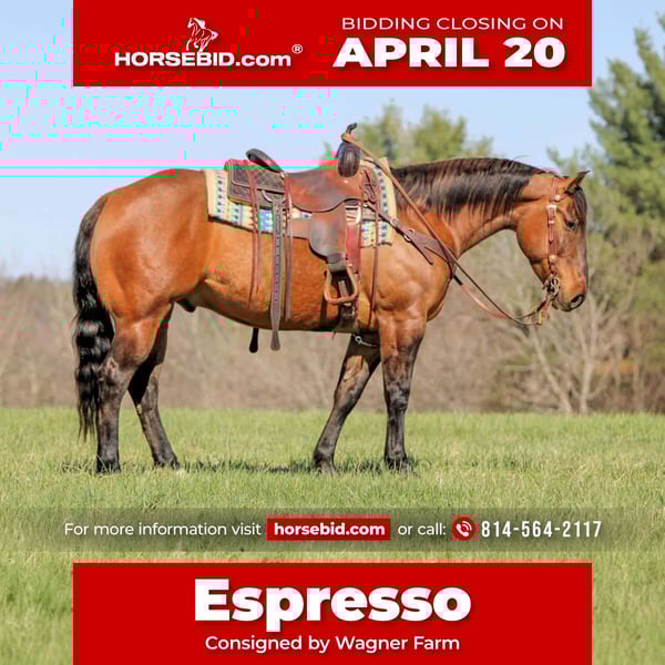 ⚜️𝐭𝐡𝐞 𝓔𝓵𝓲𝓽𝓮 𝐒𝐩𝐫𝐢𝐧𝐠 𝐂𝐥𝐚𝐬𝐬𝐢𝐜⚜️ Happening now thru MONDAY | APRIL 20th - Available EXCLUSIVELY on HorseBid's website! For more details and to register visit: www.Horsebid.com CONSIGNOR CONTACT: Wagner Farm 814-564-2117 LOCATION: Clarion, PA BREED: QH REGISTERED: No REGISTERED NAME: Espresso COLOR: Buckskin Dun HEIGHT: 15 AGE: 7 GENDER: Gelding Espresso is a 7 Year Old Super Good Looking Buckskin Dun Quarter Horse Gelding. He has all the dun factoring and dorsal strip down his back. Espresso not only is good looking but he is super good broke to ride. He has a nice one hand neck rein, good stop and backup and side pass. He is a finished trail horse, ranch horse and also rides nicely in the arena making him a complete all around good broke horse. He is a finished ranch horse that has worked for a living. He has worked on a large cattle operation and has done every job you can think of on the ranch from dragging calves to the branding fire to checking many miles of fence. When it comes to cattle he is very experienced . If you dont want a ranch horse and just want a nice relaxing trail horse. Then Espresso will work for that also as he is a great trail horse. We have trail ridden him in the mud and over logs and down the creek. Sure footed and very good on the trail. Dont miss out on this super good broke gentle horse. If i needed another horse id keep him for my personal horse. We can help arrange delivery anywhere in the United States. Call or Text Glory at 814-564-2117. Thank You and God Bless