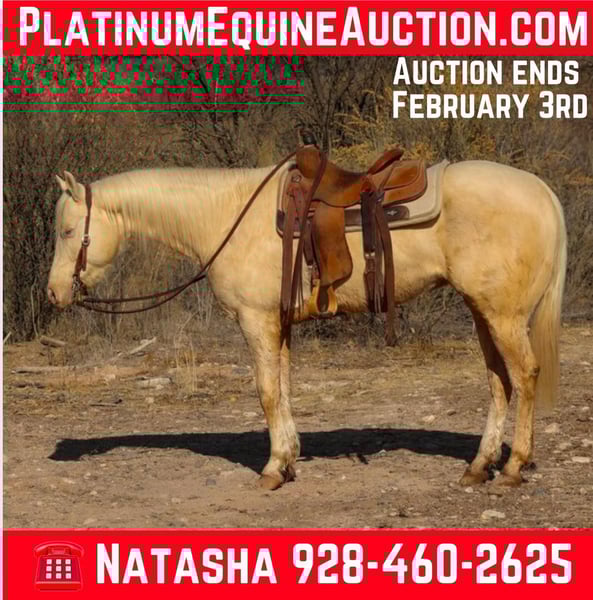 ONLINE AUCTION Place your bids at www.PlatinumEquineAuction.com Starting Bid $3500 Auction ends February 3rd, 2025 Need a new saddle? Check out White Rock Saddles on our website or Facebook! “Socially Distance” aka Biscuit is a 2019 model AQHA registered gelding standing 15hh. This good minded, gentle, extremely willing young gelding is an absolute blast to ride! Whether you’re looking for a great trail horse that will mosey on along absolutely anywhere you point him, a smooth enjoyable gelding to play around in the arena, or a nice papered horse to finish out your way, Biscuit is your guy! Biscuit will go absolutely anywhere you point him outside. Thick brushy trails, flowing water, rough rocky country, steep and windy mountains, or the busy streets of town. You name it and Biscuit will head that way with ease, and willing as ever! Not only is this gelding an absolute dream to ride outside, he’s great in the arena! He has a nice smooth walk, trot, and lope both ways! Although Biscuit isn’t the fanciest broke just yet, he is absolutely gentle! We’ve had kiddos and riders of all levels ride him and they’ve all absolutely loved him! Biscuit is as willing and good minded as one can get and would be super easy to make fancy if that’s the direction you wanted to take him. Biscuit is good to catch, groom, saddle, bridle, bathe, shoe, and load! Will come with a clean coggins and health, as well as a lameness exam from my vet. Transport can easily be arranged anywhere in the US!!! D/C Equine Services Dallas 804-822-2233 or Natasha 928-460-2625 Located in Camp Verde, AZ. ONLINE AUCTION Place your bids at www.PlatinumEquineAuction.com Starting Bid $3500 Auction ends February 3rd, 2025 Need a new saddle? Check out White Rock Saddles on our website or Facebook!