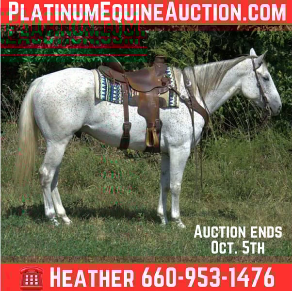 ONLINE AUCTION Place your bids at www.PlatinumEquineAuction.com Starting Bid $3500 Auction ends October 5th, 2025 Need a new saddle? Check out White Rock Saddles on our website or Facebook Leo’s Peppy Cowman “King” – Trail Horse Deluxe!!! Meet King, a 2019 model reg AQHA gelding that stands 15.1hh… he is the kind of horse everyone wishes they had in their barn. He’s the ultimate safe and reliable trail partner that will take care of you every single ride. Saddle him straight out of the stall or pasture and ride off like he’s never missed a day. King is soft in the bridle, responsive to his cues, and has a true one-hand neck rein. He will cross ditches, go through water, and doesn’t mind traffic, dogs, or equipment. Out on the ranch, he has been used to gather cattle and has the willingness and potential to go in any direction you choose. This gelding is the definition of steady and dependable. He stands for grooming and the farrier, hauls easily, and eats and drinks well on the road. King is 100% sound, up to date on vaccinations and worming, and ready to be someone’s next trusted family horse. If you’re looking for a kind, willing partner that will last you for years to come, King is the one. Located in Princeton, MO. For more info, call Heather Stark 660-953-1476. ONLINE AUCTION Place your bids at www.PlatinumEquineAuction.com Starting Bid $3500 Auction ends October 5th, 2025 Need a new saddle? Check out White Rock Saddles on our website or Facebook