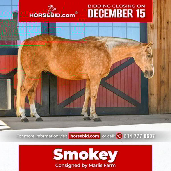 🎄𝐓𝐇𝐄 𝑯𝒐𝒍𝒊𝒅𝒂𝒚 𝐂𝐋𝐀𝐒𝐒𝐈𝐂🎄 Happening now thru MONDAY | DECEMBER 15th - Available EXCLUSIVELY on HorseBid's website! For more details and to register visit: www.Horsebid.com CONSIGNOR CONTACT: Marlis Farm 814 777 0607 LOCATION: Rebersburg PA BREED: Quarter horse REGISTERED: Yes REGISTERED NAME: Cinder Smokin Cash COLOR: Palomino HEIGHT: 15.1 AGE: 6 GENDER: Gelding Cinder Smokin Cash AKA Smokey is a registered 15.1 hand palomino AQHA gelding that rides as good as he looks. Smokey is well trained in and out of the arena, in the arena he picks up both his leads and has a smooth walk, trot and canter. Smokey neckreins, side passes and has a good stop, he is soft in the bridle and responsive to leg pressure. Smokey also rides english and loves to take a jump. He is a seasoned trail horse and will go over logs, through water and wherever you point him. We have also taken Smokey down the main highway into town to run errands and he doesnt mind all the traffic and commotion. Besides all that did i mention how quiet and gentle Smokey is ,you can never give him to much attention as he loves every bit of it. My boys can get him out and brush, lead and play around him and he takes care of them. We also used him to give some lessons. My 5yr old son can ride him in the arena and Smokey enjoys every minute of it, he does not get irritated if you give him the wrong cues. Smokey does well inside and turned oit in a mixed herd, he stands to be tacked, washed and for the farrier. He loads and unloads like a champ. Smokey sells sane, safe and sound. If this is the kind of gelding you or your family has been looking for feel free to reach out with any questions! If you would like to come meet him call Mark 814 777 0607 (call only) We can arrange shipping anywhere!