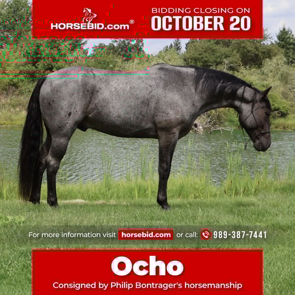 ♦️ 𝐭𝐡𝐞 𝐀𝐌𝐄𝐑𝐈𝐂𝐀𝐍 𝓕𝓪𝓵𝓵 𝓒𝓵𝓪𝓼𝓼𝓲𝓬 ♦️ Happening now thru MONDAY | OCTOBER 20th - Available EXCLUSIVELY on HorseBid's website! For more details and to register visit: www.Horsebid.com CONSIGNOR CONTACT: Philip Bontrager's horsemanship 989-387-7441 LOCATION: Howell MI BREED: Quarter horse REGISTERED: No COLOR: Blue roan HEIGHT: 15.1 AGE: 6 GENDER: Gelding Meet Ocho! Ocho is a 7yr old beautiful blue roan grade Quarter horse gelding. He stands 15.1hh and weighs around 1,100 lbs. Ocho rides english and western. He rides good in the arena and outside. Ocho is good with arena work, he lopes circles,takes both leads,and is soft in the bridle. He has a nice walk, trot, and canter. Ocho loads, clips, and baths good. While Ocho is not a beginners he has absolutely no buck in him. He is an all around riding horse for anyone that knows how to ride. He enjoys going on a trail or road ride. Ocho is very friendly and easy to catch in the field. With his beautiful blue roan coat he will stand out wherever you take him. For more information or to schedule a visit please Call Phil @ 989-387-7441.