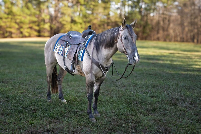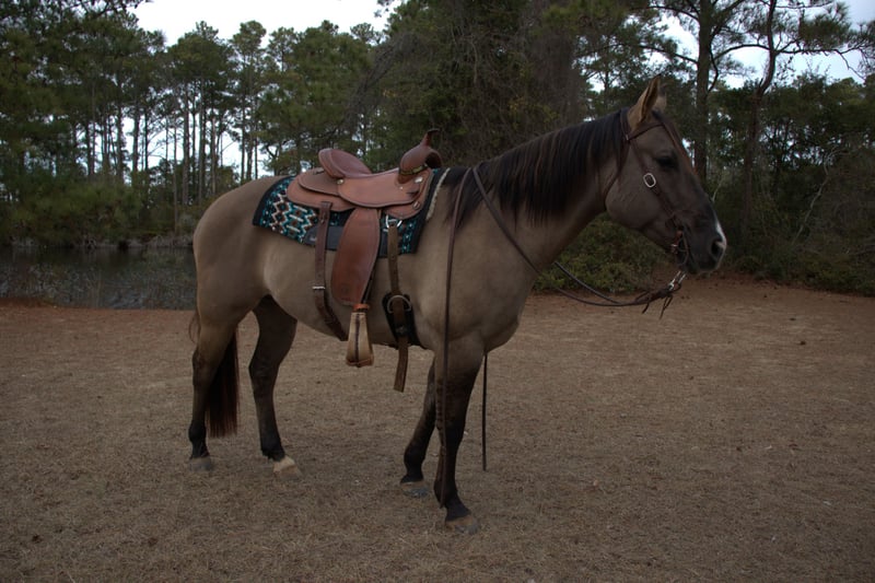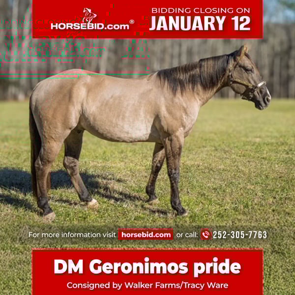 ♦️𝐍𝐄𝐖 𝐘𝐄𝐀𝐑'𝐒 𝑬𝒙𝒕𝒓𝒂𝒗𝒂𝒈𝒂𝒏𝒛𝒂♦️ Happening now thru MONDAY | JANUARY 12th - Available EXCLUSIVELY on HorseBid's website! For more details and to register visit: www.Horsebid.com CONSIGNOR CONTACT: Walker Farms/Tracy Ware 252-305-7763 LOCATION: Manns Harbor, NC BREED: Quarter horse REGISTERED: Yes REGISTERED NAME: DM GERONIMOS PRIDE COLOR: Grullo HEIGHT: 15.2 AGE: 7 GENDER: Gelding Meet Pride a 2018 AQHA gelding with the kind of temperament and sought after color everyone is looking for. Pride is wonderful on the ground always waiting at the gate for you. He is great for the farrier, saddling, bathing, or pretty much anything you ask him to do. Pride rides quietly in the arena and is confident out on the trails alone or with a group. He will sidepass over to a mounting block to pick up his rider, he handles gates, is confident with dogs, has cattle experience and ranch broke. Pride has a great mind, calm, patient and eager to please. Whether your searching for a trusted trail companion, ranch horse or ranch trail class 4H horse Pride is that horse.