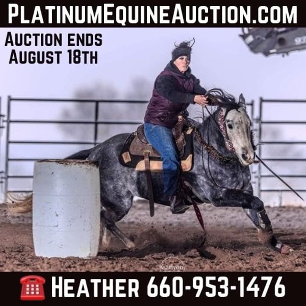 ONLINE AUCTION Place your bids at www.PlatinumEquineAuction.com Starting Bid $3500 Auction ends August 18th, 2024 Need a new saddle? Check out White Rock Saddles on our website or Facebook! I am honored to be able to offer this reliable gelding, “Bleau”! Bleau has so much to offer to his rider, he loves to please his rider! He has the potential to go in many directions, has experience as a barrel horse and a trail horse. Bleau maneuvers beautifully with ease through his slow, smooth trot and lope, you can put him on autopilot as he transition leads effortlessly. Bleau has all the right moves, you can easily navigate him with one hand on a loose rein. “Bleau” has money earners top and bottom of his papers with, including 3 triple crowns. A grandson of the great “Chicks Beduino” earnings of over $400,00 himself. “Azure Request” earning over a quarter of a million dollars. “Tiny Watch” a well known prolific barrel sire of many great horses, a great grandsire of “Bozo.” Our family has owned Bleau since he was a yearling, we purchased him as a baby out of North Dakota. It has been an honor owning this quality of gelding and developing him into the gentleman he is. Bleau has great ground manners, he loves a nice bath, stands like one should with patience and is a gentleman for the farrier. Bleau is even more enjoyable under saddle, he has a big heart and goes willingly where you point him in such a smooth gate. He crosses ditches, creeks, rides along traffic, farm equipment, dogs tagging along. I think he enjoys it just as much as his pilot. Bleau has been hauled several places in the midwest. He has been exposed to many new environments and handles himself with ease each time. He is not limited to trail riding, he has been used to check cattle and has 120+ days on barrels. Bleau loves to run barrels, he will enter the gate quietly and do his job. Bleau has been hauled to jackpots and expos at youth rodeos. He will go as fast as you ask him, with no doubt he can be clocking in the 1D with little time. He will make a very nice pole horse, he has incredible lead changes, it comes so naturally for him. I have started him on the poles. We have not hauled him to barrels races as much as we’d like this year, but he is ready to haul down the road and find his new life long partner that he deserves! Bleau is 100% sound, he is up to date on all vaccinations! Call us to meet Bleau and ask any questions you might have! We would love to help Bleau and his new owner with a smooth transition and find a loving partner! Contact Heather Stark 660-953-1476 with any questions. Located in Princeton, MO. ONLINE AUCTION Place your bids at www.PlatinumEquineAuction.com Starting Bid $3500 Auction ends August 18th, 2024 Need a new saddle? Check out White Rock Saddles on our website or Facebook!