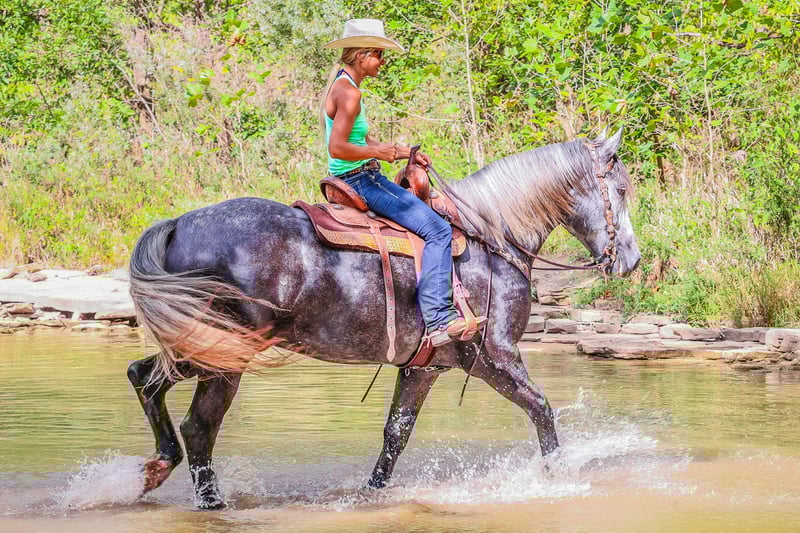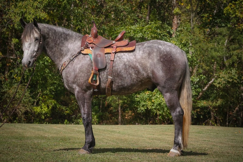 ONLINE AUCTION Place your bids at www.PlatinumEquineAuction.com Starting Bid $3500 Auction ends October 6th, 2024 Need a new saddle? Check out White Rock Saddles on our website or Facebook! This is “Austin”, A GREAT MINDED, PROFESSIONALLY TRAINED, and GENTLE DAPPLE GRAY PERCHERON QUARTER HORSE CROSSBRED GELDING. This gelding is broke to ride and drive. He stands 16.3 hands tall and is 5 years old. This gelding is a gorgeous steel gray with big dapples all over him. He has been used for ranch work and is handy, athletic, responsive, and obedient. He will sit down and turn around, stop easily on whoa, back up for ANY distance, and he moves off of leg and seat cues. This gelding stands to harness, hitch, tack, mount, and groom. He has excellent ground manners, he is not spooky, and he is traffic safe. He will lope and jog nice circles, he catches his leads, and will one step lope. He rides and drives collected, calm, and cool. He has been on cross country wagon rides and will go through the deep water quietly and he will go up and down the steep hills relaxed. He won’t go any faster than you ask of him and he is not chargy. He is patient, kind, and willing. He will ride out alone with no problems and also rides in a large group. He has been on camping trips at state parks and will stand tied overnight. He is everything you want all in one package. He has the size, the build, the look, the color, the brains, the ability, the training, and the attitude that will make you happy. He is good with all other horses and unloads in new surroundings quietly. He is fun to ride, easy to drive, and has a head full of sense. Located in Flemingsburg, KY. Contact HH Horses Erin 304-238-4155. ONLINE AUCTION Place your bids at www.PlatinumEquineAuction.com Starting Bid $3500 Auction ends October 6th, 2024 Need a new saddle? Check out White Rock Saddles on our website or Facebook!