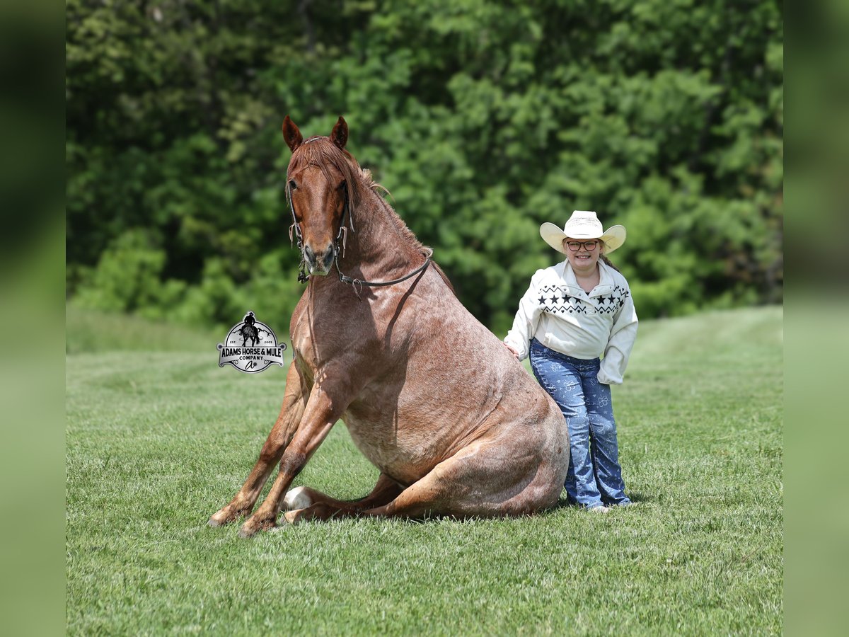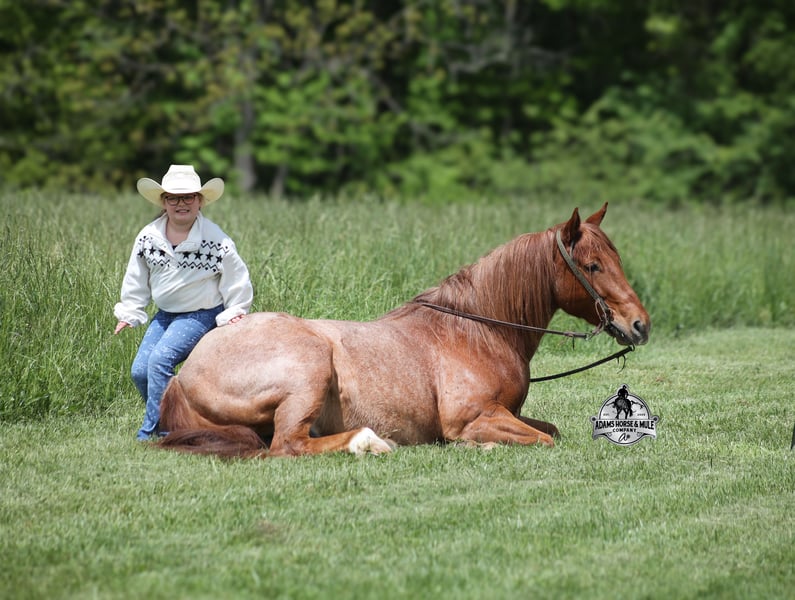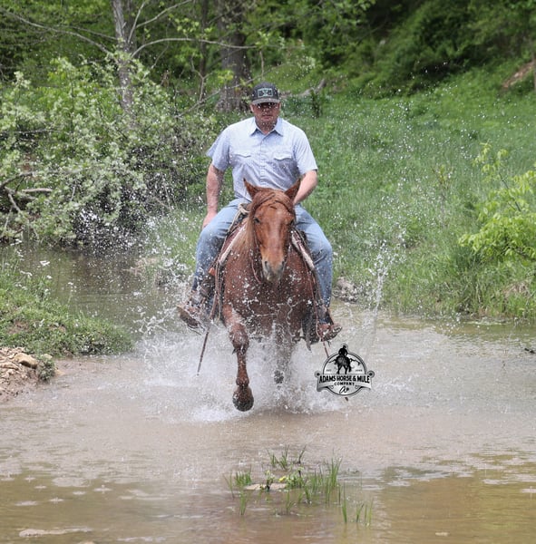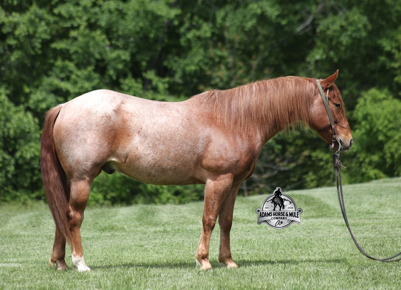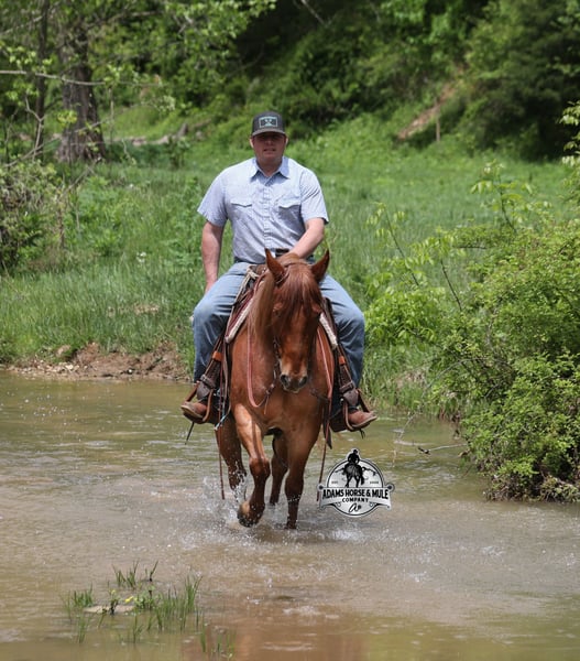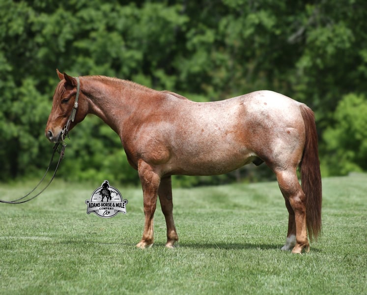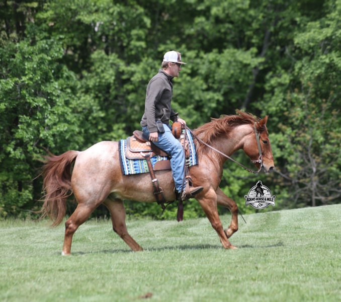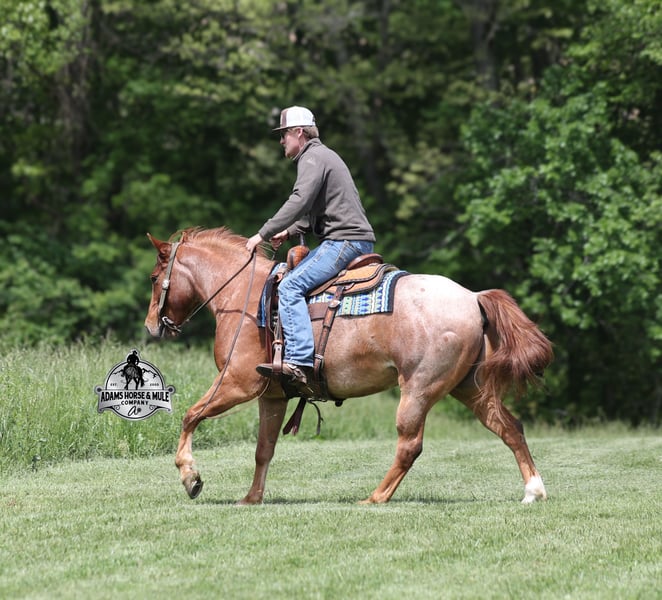 If your confidence levels are low and you have had nothing but bad luck with you other horses… just say Adios to those days because this guy is going to fix all of that! Adios is a beautiful red roan Gelding that is very stocky built, he is 6 years old and is standing right at 14.3hh! Adios has completed the natural horsemanship program and he is very friendly and loves attention!! He knows some tricks as well as he will lay down and set on command. Adios has done it all from being ridden by small children down the highways to being ridden around the ranch, checked cows, rode fences and cruised the trails. He is a laid back type of guy that will just plod along down the trails with no hesitation and not in a hurry. He has been on camping trips and has been ridden by all ages of riders from 6 to 86 that guy will be safe and easy to ride. When out on the ranch or going down the trails he will cross creeks, ditches, logs and navigate rough, rocky areas. He is safe in traffic safe whether that be trucks or cars. He walks on a loose rein, has a nice jog, his lope is slow and collected plus he lopes very nice circles on a loose/draped rein! He has been exposed to all kinds of wildlife such as deer or turkey. He is athletic and would be a great horse to put under English tack to go over the rails with. He pastures well with others and rides the same after time off. Adios is one that the whole family will love, he will be perfect for the guest to ride with a personality that will make him everyone’s best friend! Feel free to call Eric 606-308-2461 with any questions! Go to visit our website for more pics and a video www.AdamsHorseAndMuleCo.com AHAMC has been in the horse business and sold horses over the internet since 2005. We have a long track record of success with hundreds of happy customers. We work hard to match riders with the correct horses and specialize in beginner safe, family friendly horses that have been used and checked out by our family! We can set up transportation anywhere in the US and look forward to working with you.