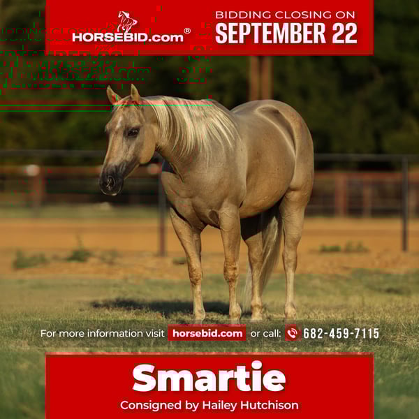 🍁𝒕𝒉𝒆 𝐅𝐀𝐋𝐋 𝑺𝒑𝒆𝒄𝒕𝒂𝒄𝒖𝒍𝒂𝒓🍁 Happening now thru MONDAY | SEPTEMBER 22nd - Available EXCLUSIVELY on HorseBid's website! For more details and to register visit: www.Horsebid.com CONSIGNOR CONTACT: Hailey Hutchison 682-459-7115 LOCATION: Joshua TX BREED: Quarter Horse REGISTERED: No COLOR: Palomino HEIGHT: 14 AGE: 7 GENDER: Gelding Smartie is 7 years old, stands 14 hands tall, and the most lovable little palomino gelding!! Perfect gentleman on the ground- easy to catch, stands quietly to be groomed, tacked up, and for a bath. Loads/ hauls great, good turned out with other horses. Curious, super gentle, loves to be loved on, and ready for a new adventure every day! Smartie has been used for everyday task on the ranch, ridden outside to gather cattle, worked in the feed yard moving horses, and hundreds of miles out on the trails. He has a smooth ground covering walk, sure footed in different types of terrain, and is comfortable to cruise around on all day. Crosses logs, rides thru water, and goes where-ever he’s pointed to. One handed easy neck rein, soft behind the bridle, lopes circles in the arena, and picks up both leads. Handy guy to have around to do any chore! 𝙄𝙩’𝙨 𝙞𝙢𝙥𝙤𝙨𝙨𝙞𝙗𝙡𝙚 𝙣𝙤𝙩 𝙩𝙤 𝙖𝙙𝙤𝙧𝙚 𝙝𝙞𝙢!💛😇
