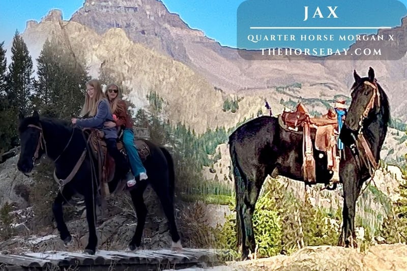 Jax is a 2018 model standing 14.1 hands, a striking black Morgan–Quarter Horse cross who has been a ranch favorite from the day we brought him home. He’s the kind of horse everyone in the family wants to ride. Jax has done the real work. He’s packed elk, bighorn sheep, mountain lions, and has safely carried little kids, grandmas, and everyone in between. Whether you need him to lead the pack string or ride anywhere within it, Jax handles the job with ease. This is a true family-safe horse. He’s gentle enough for beginners and children, yet still enjoyable for experienced riders. Jax naturally adjusts his energy to match his rider, helping inexperienced riders feel comfortable and confident in the saddle. Out on the trail, Jax can really cover some country with a big, ground-covering walk. When needed, he’s just as happy to slow down and plod along. He’s been ridden extensively in extremely rough mountain terrain and is exceptionally sure-footed. We live in the heart of the Rocky Mountains, so when we say rough country, we mean it—down timber, shale slides, ice, mud, bogs, rivers, snow, steep terrain, bikes, dogs, and wildlife. Jax handles it all without hesitation and stays calm and dependable. He’s also fun to ride around the ranch or in the arena. Jax lopes nice correct circles, picks up his leads, has flying lead changes, and a good stop. He’s confident in town and handles traffic without issue. Jax has never offered to buck, bolt, or cause trouble. He’s easy to catch in the pasture and is a pleasure to shoe, saddle, bridle, and handle in every way. Absolutely no vices. Our family lives on a private ranch in Wyoming just outside Yellowstone National Park. We don’t just visit the mountains—we live and work here, making our living horseback. Our horses are exposed daily to wildlife, rough terrain, and real ranch conditions. We are not horse traders. Each year we only offer a select few of our best horses, and this year Jax is one of them. There will certainly be a few wet eyes when he leaves, but our horses always go on to great homes and lasting friendships. There’s no “gotcha” with Jax—if something isn’t mentioned here, it’s only because we forgot to write it down. Bid with confidence on this once-in-a-lifetime gelding.